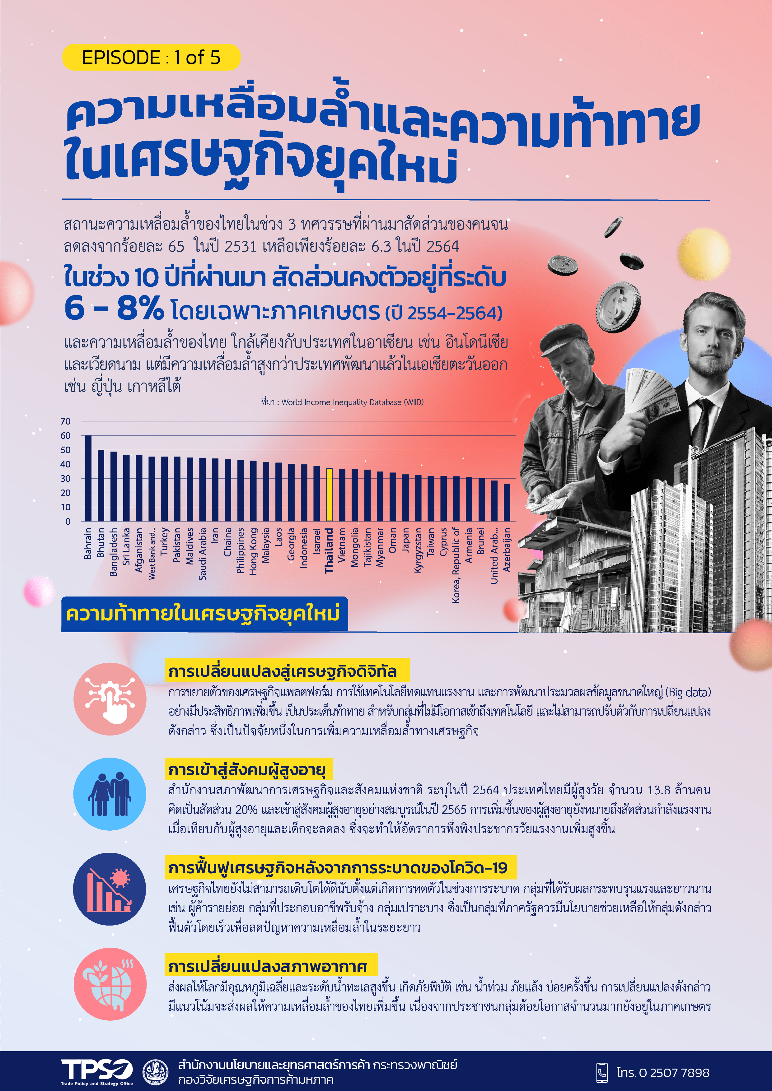 กระทรวงพาณิชย์ วิเคราะห์การเติบโตของเศรษฐกิจไทย พบยังมีปัญหาความเหลื่อมล้ำที่เป็นประเด็นความท้าทายของประเทศ ชี้การเข้าสู่เศรษฐกิจดิจิทัล สังคมสูงอายุ การฟื้นฟูเศรษฐกิจหลังโควิด-19 การเปลี่ยนแปลงสภาพอากาศ เป็นปัจจัยท้าทายที่ทำให้เกิดความเหลื่อมล้ำมากขึ้น แนะรัฐ เอกชน และภาคประชาชน ร่วมมือกันเตรียมพร้อมและรับมือกับปัญหาความเหลื่อมล้ำ