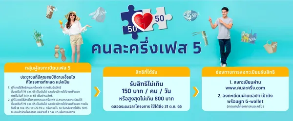หลังจากคณะรัฐมนตรี มีมติอนุมัติกรอบวงเงิน รวม 21,200 ล้านบาท เพื่อใช้ในโครงการ “คนละครึ่ง เฟส 5” ซึ่งจะเริ่มให้ประชาชนใช้สิทธิได้ตั้งแต่วันที่ 1 กันยายน- 31 ตุลาคม 2565  โดยให้สิทธิคนละ 800 บาท ตลอดโครงการ และใช้จ่ายค่าอาหารเครื่องดื่มสินค้าและบริการทั่วไปรวมถึงบริการขนส่งสาธารณะที่กำหนดในอัตราร้อยละ 50 ไม่เกิน 150 บาท/คน/วัน