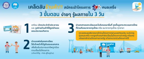โดยผู้ประกอบการที่เคยเข้าร่วมมาตรการ/โครงการอื่นของรัฐที่มีแอปพลิเคชัน “ถุงเงิน” แล้ว และประสงค์จะเข้าร่วมโครงการต่อไปจะต้องลงทะเบียนผ่านแอปพลิเคชัน “ถุงเงิน” ส่วนผู้ที่ไม่เคยเข้าร่วมมาตรการ/โครงการอื่นสามารถลงทะเบียนผ่านเว็บไซต์ www.คนละครึ่ง.com หรือสาขาหรือจุดรับลงทะเบียนของธนาคารกรุงไทยฯ