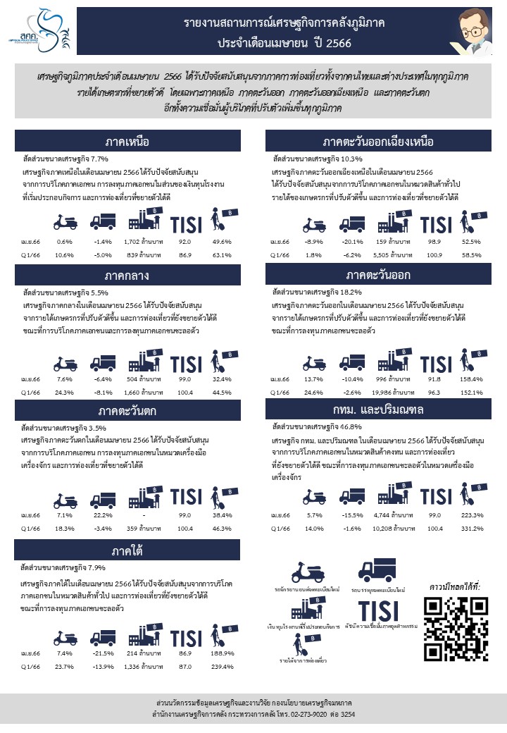 นายพรชัย ฐีระเวช ผู้อำนวยการสำนักงานเศรษฐกิจการคลัง (สศค.) เปิดเผยว่า ภาวะเศรษฐกิจภูมิภาคประจำเดือนเม.ย. 66 ได้รับปัจจัยสนับสนุนจากภาคการท่องเที่ยว ทั้งจากคนไทยและต่างประเทศในทุกภูมิภาค รายได้เกษตรกรที่ขยายตัวดี โดยเฉพาะภาคเหนือ ภาคตะวันออก ภาคตะวันออกเฉียงเหนือ และภาคตะวันตก อีกทั้งความเชื่อมั่นผู้บริโภคที่ปรับตัวเพิ่มขึ้นทุกภูมิภาค