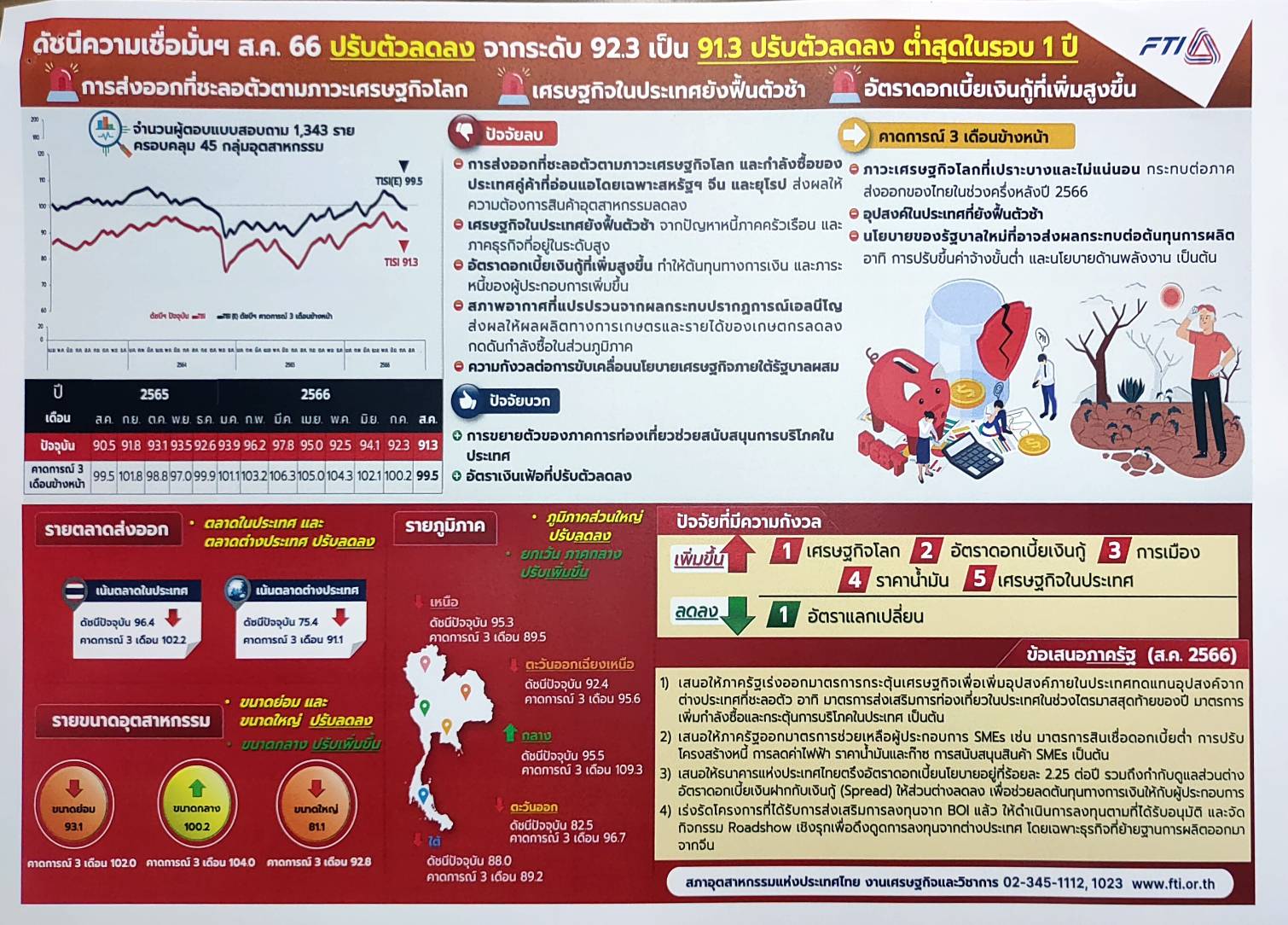 สภาอุตสาหกรรมแห่งประเทศไทย (ส.อ.ท.) แถลงผลสำรวจดัชนีความเชื่อมั่นภาคอุตสาหกรรมในเดือน ส.ค.66 อยู่ที่ระดับ 91.3 ปรับตัวลดลง จาก 92.3 ในเดือน ก.ค.66 ปรับตัวลงดิดต่อกันเป็นเดือนที่สอง และต่ำสุดในรอบ 1 ปี เมื่อพิจารณาองค์ประกอบของค่าดัชนีฯ พบว่าปรับตัวลดลงเกือบทุกองค์ประกอบ ทั้งดัชนีฯ คำสั่งซื้อโดยรวม ยอดขายโดยรวม ปริมาณการผลิต และผลประกอบการ ยกเว้นต้นทุนประกอบการ