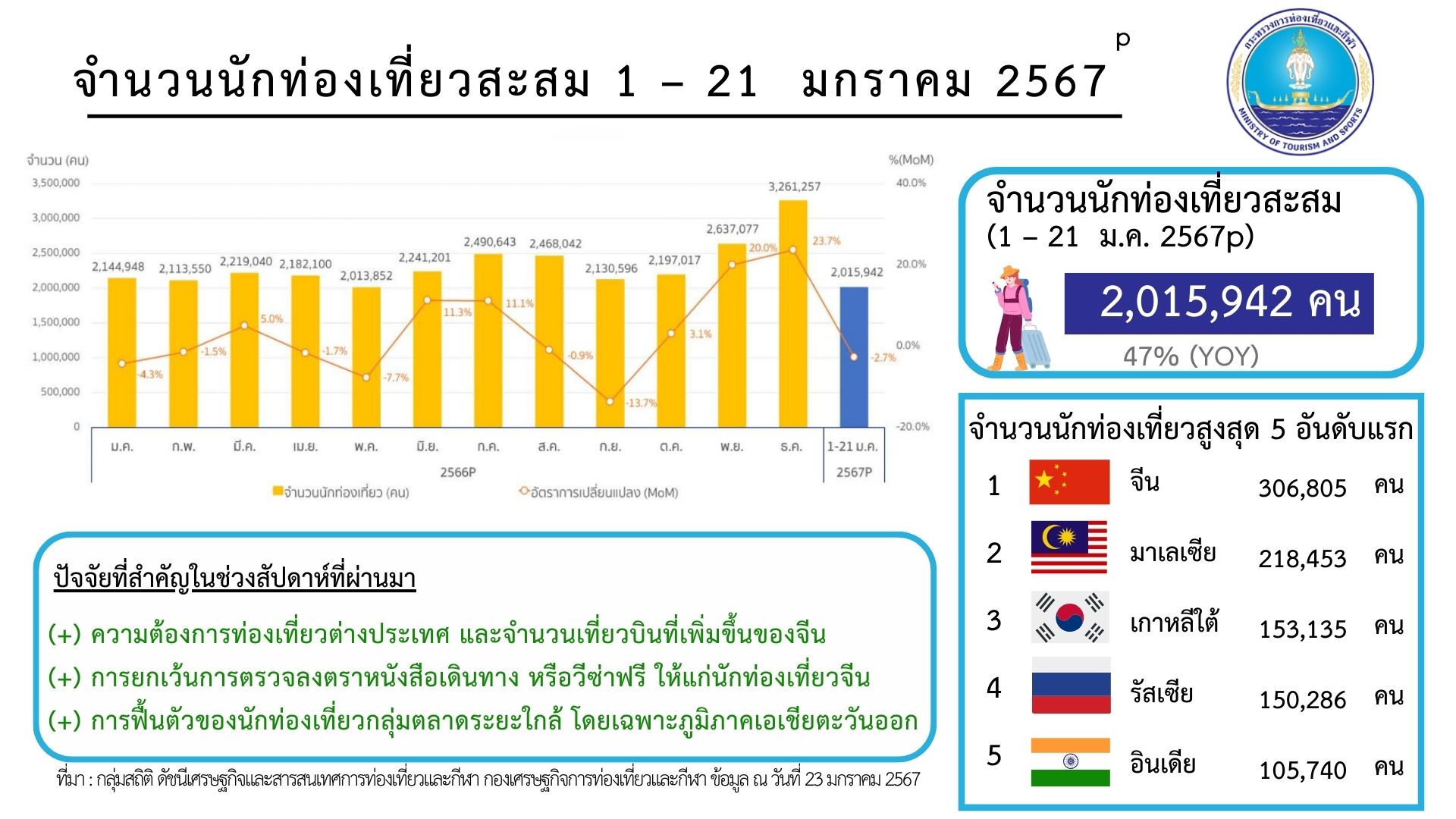สำหรับประเทศไทย ข้อมูล ณ วันที่ 22 ม.ค. 67 พบว่า มีจำนวนนักท่องเที่ยวสะสมตั้งแต่วันที่ 1-21 ม.ค. 67 ที่ผ่านมาทั้งสิ้น 2,015,942 คน สร้างรายได้จากการใช้จ่ายของนักท่องเที่ยวต่างชาติแล้วประมาณ 97,911 ล้านบาท โดยจำนวนนักท่องเที่ยวสูงสุด 5 อันดับแรก อันดับ 1 คือ กจีน 306,805 คน รองลงมา คือมาเลเซีย 218,453 คน เกาหลีใต้ 153,135 คน รัสเซีย 150,286 คน และอินเดีย 105,740 คน ตามลำดับ