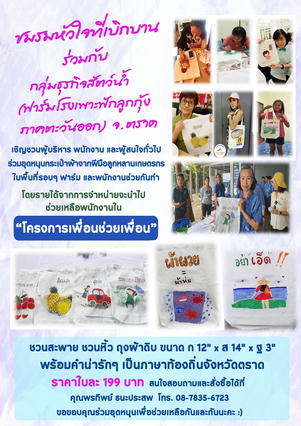 เชิญชวนผู้บริหาร พนักงาน และผู้สนใจทั่วไป ร่วมอุดหนุนกระเป๋าผ้าจากฝีมือลูกหลานเกษตรกร พื้นที่รอบๆฟาร์มและพนักงานช่วยกันทำ โดยรายได้จากการจำหน่ายจะนำไปช่วยเหลือพนักงานในโครงการเพื่อนช่วยเพื่อน 4 ธันวาคม 256211 ธันวาคม 2019SystemNews, กิจกรรมเพื่อสังคม Post Views: 1,452