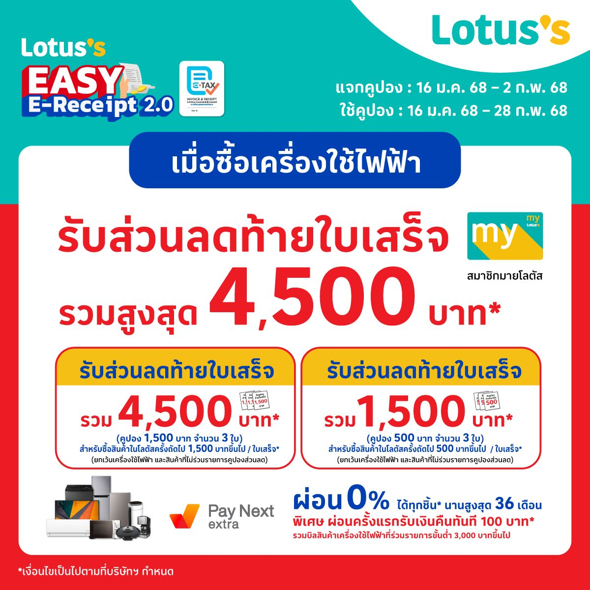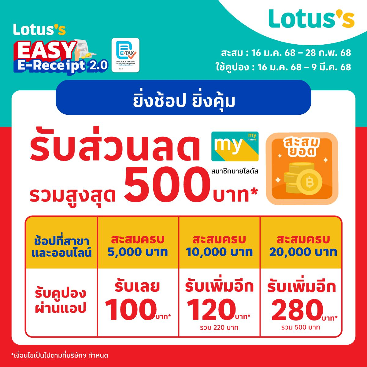 - แคมเปญ ‘ช้อปมาก ได้มาก เลือกช้อปตามใจ’ สมาชิกมายโลตัสสะสมยอดใช้จ่ายจากการช้อปทางสาขาและออนไลน์ ตั้งแต่ 5,000 – 20,000 บาท รับส่วนลดรวมสูงสุด 500 บาท สะสมได้ตั้งแต่วันที่ 16 มกราคม – 28 กุมภาพันธ์ 2568 และใช้คูปองได้ถึงวันที่ 9 มีนาคม 2568