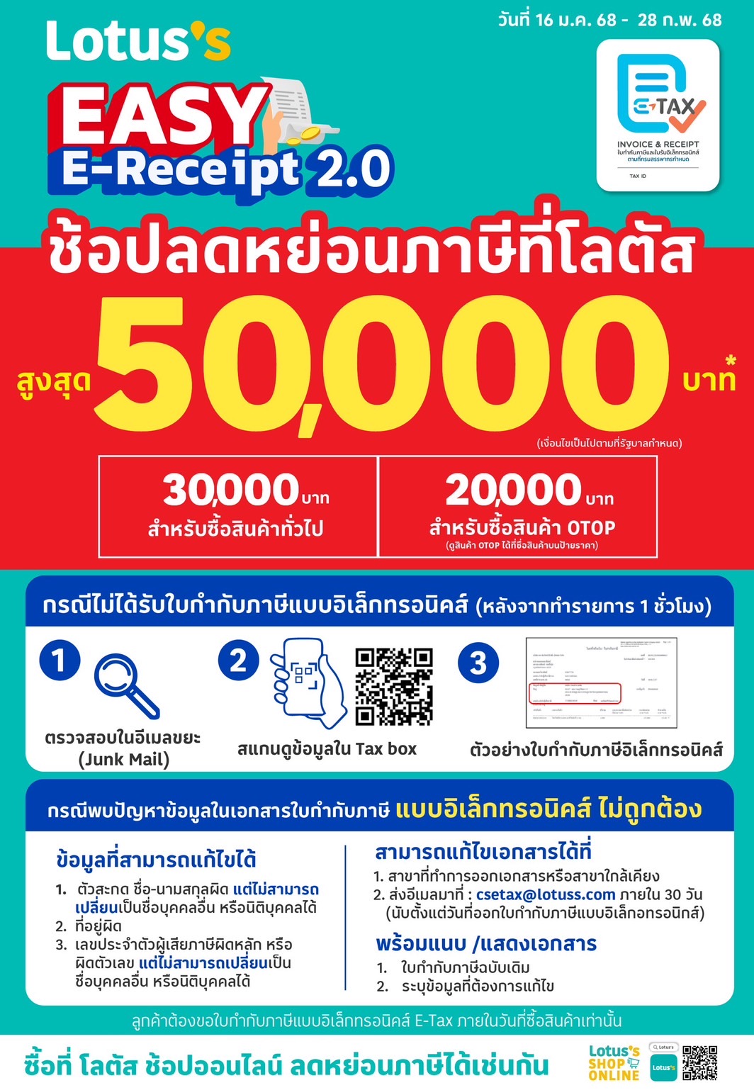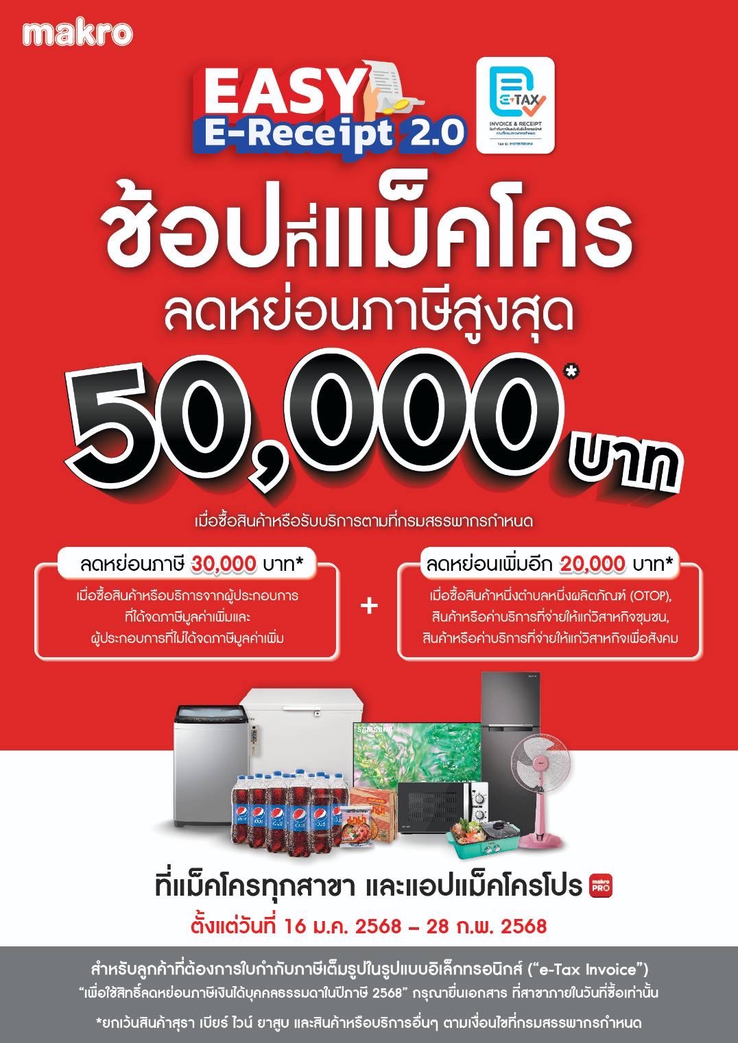 กรุงเทพฯ 16 มกราคม 2568 – บริษัท ซีพี แอ็กซ์ตร้า จำกัด (มหาชน) ผู้ดำเนินธุรกิจค้าส่งค้าปลีก “แม็คโคร-โลตัส” ร่วมกระตุ้นการจับจ่ายในไตรมาสแรก ขานรับนโยบายภาครัฐ ‘Easy E-Receipt 2.0’ ชวนคนไทย ช้อปสินค้าคุณภาพในราคาคุ้มค่า หลากหลายรายการ ที่แม็คโครและโลตัส ทุกสาขาทั่วประเทศ โดยลูกค้าสามารถแสดงใบเสร็จรับเงินที่ซื้อสินค้าภายในวันนั้น ๆ พร้อมบัตรประชาชน รับใบกำกับภาษีอิเล็กทรอนิกส์ (e-Tax Invoice) หรือ ใบรับอิเล็กทรอนิกส์ (e-Receipt) ที่จุดบริการลูกค้า รวมถึงแอปพลิเคชันออนไลน์ ทั้ง Makro PRO และ Lotus’s SMART App อีกทั้งยังเปิดพื้นที่ขายฟรีให้ผู้ประกอบการ OTOP วิสาหกิจชุมชน และวิสาหกิจเพื่อสังคม ที่เข้าร่วมโครงการ Easy E-Receipt ที่โลตัสทุกภูมิภาค ได้ออกบูธจำหน่ายสินค้า เพื่อให้ลูกค้านำไปใช้สิทธิ์ลดหย่อนภาษีปี 2568 สูงสุดถึง 50,000 บาท ตั้งแต่ 16 มกราคม – 15 กุมภาพันธ์ 2568