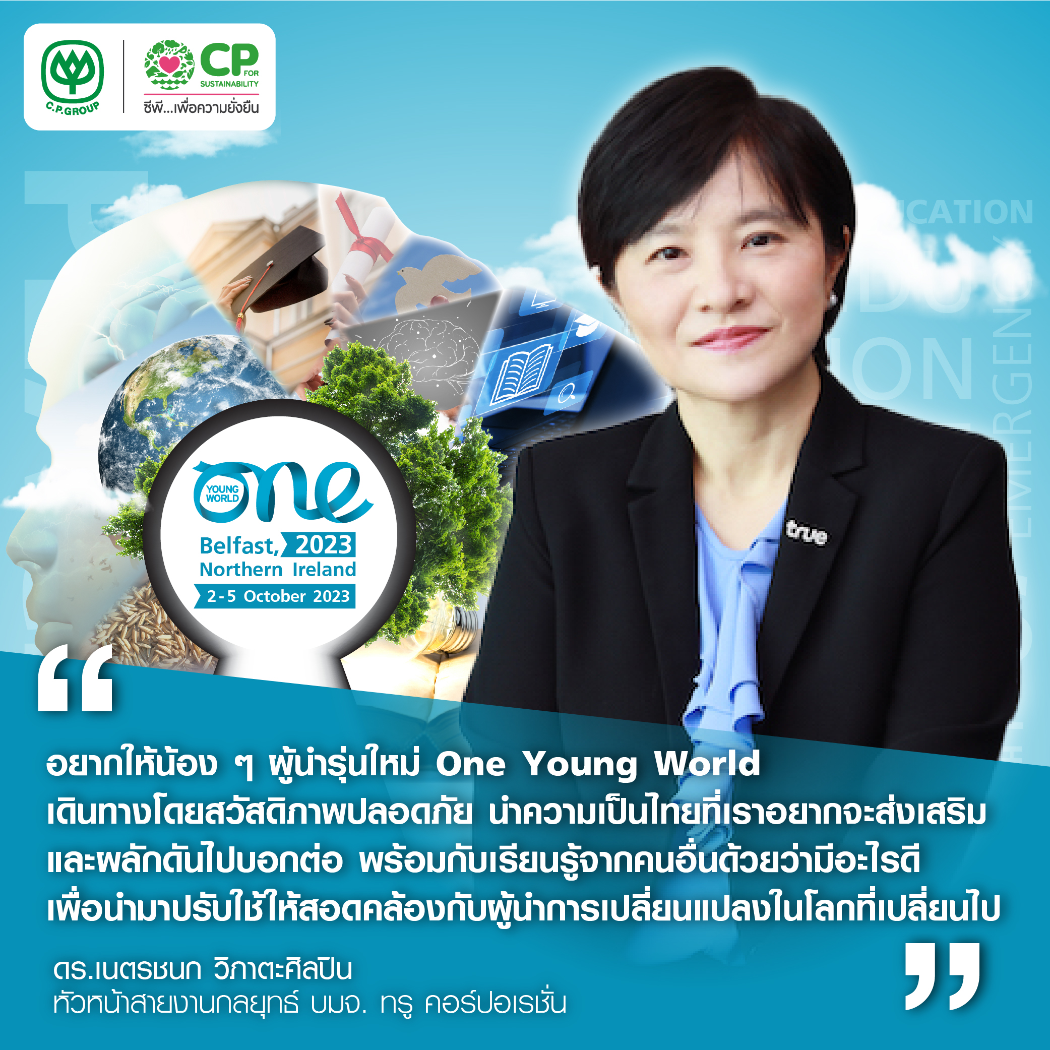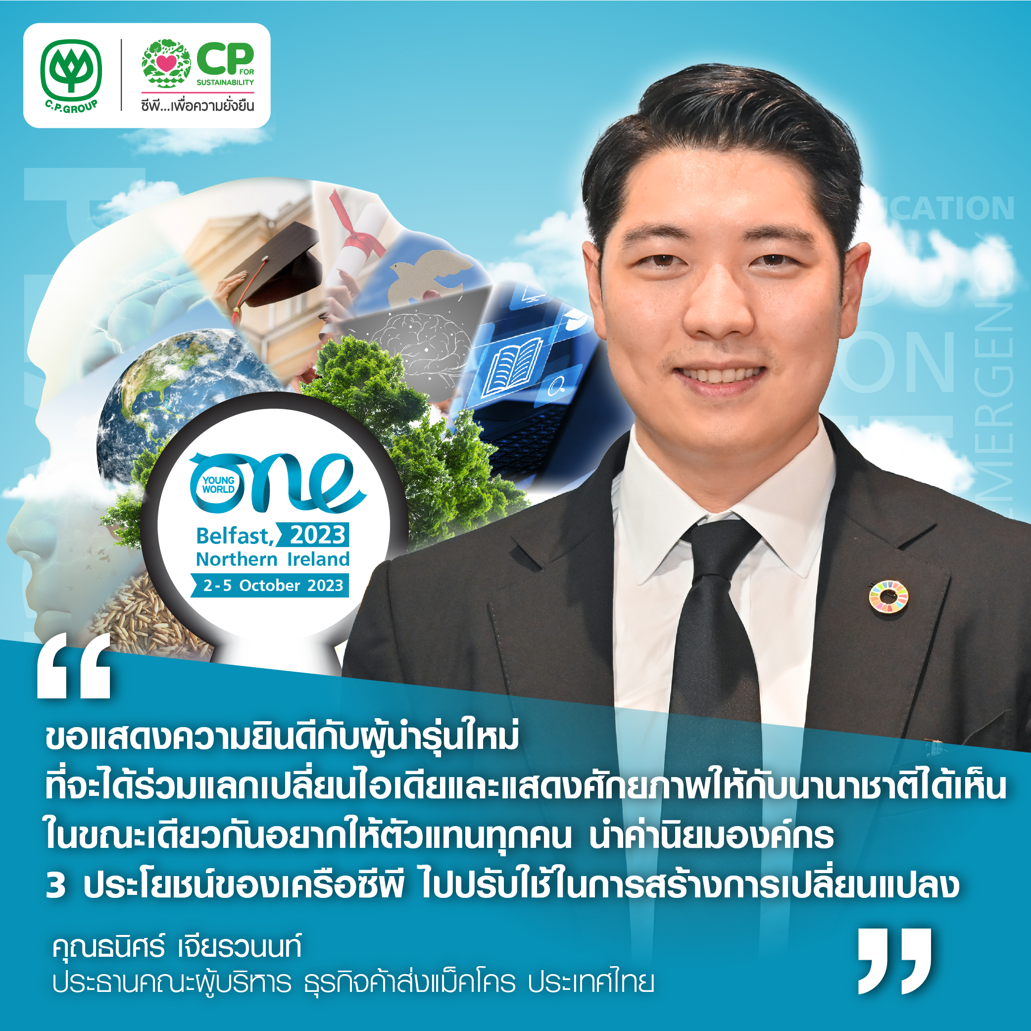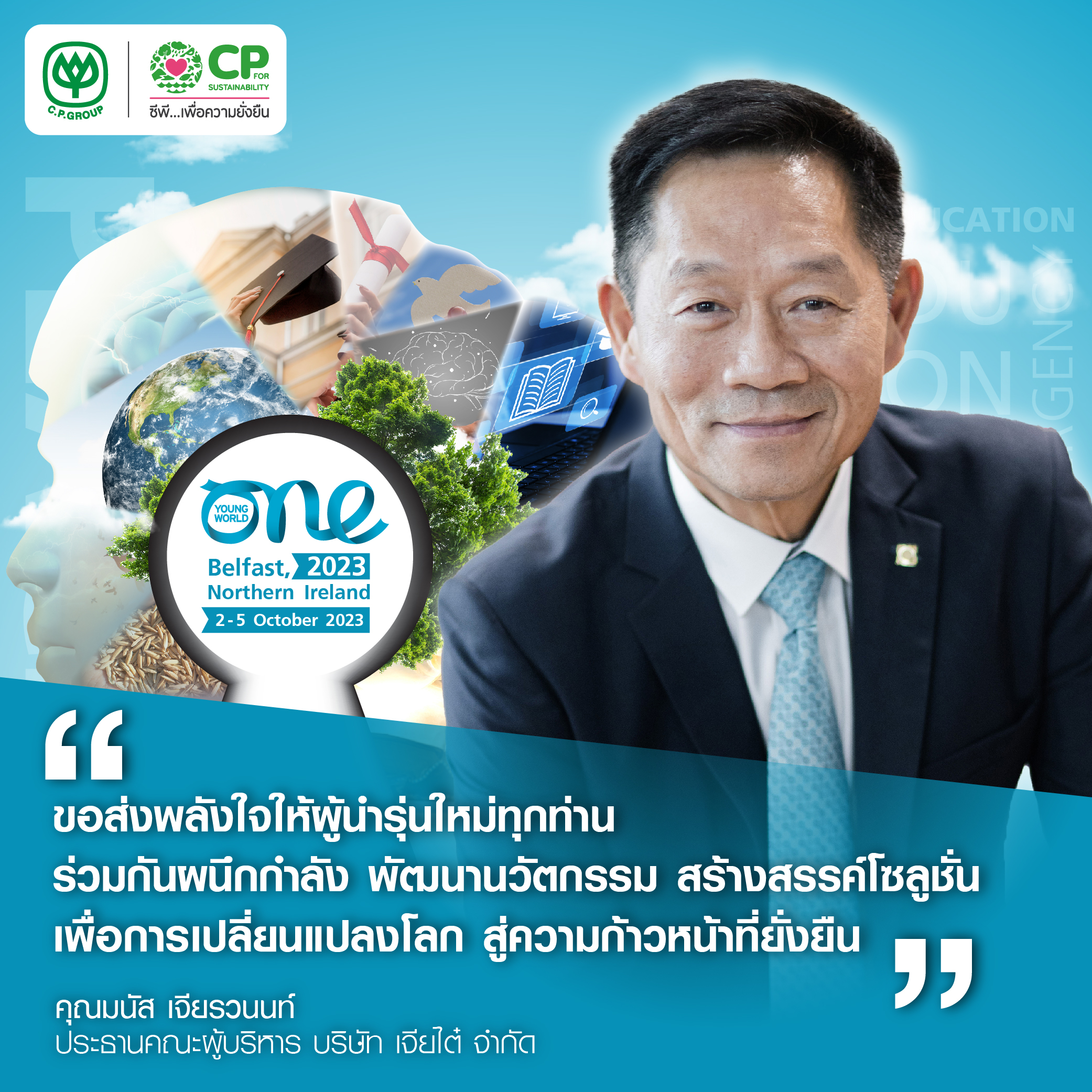 คุณศุภชัย เจียรวนนท์ ประธานคณะผู้บริหาร เครือเจริญโภคภัณฑ์ คุณมนัส เจียรวนนท์ ประธานคณะผู้บริหาร บริษัท เจียไต๋ จำกัด คุณธนิศร์ เจียรวนนท์ ประธานคณะผู้บริหาร ธุรกิจค้าส่งแม็คโครประเทศไทย คุณวิชัย  จันทร์จริยากุล กรรมการผู้จัดการ (ร่วม) บมจ.ซีพี ออลล์ คุณสมเจตนา ภาสกานนท์ ผู้อำนวยการด้านพัฒนาความยั่งยืน สำนักบริหารความยั่งยืน ธรรมาภิบาลและสื่อสารองค์กร เครือเจริญโภคภัณฑ์ และ ดร.เนตรชนก วิภาตะศิลปิน หัวหน้าสายงานกลยุทธ์  บมจ. ทรู คอร์ปอเรชั่น ร่วมส่งกำลังใจแก่ผู้นำรุ่นใหม่จำนวน 20 คน แสดงพลังบนเวทีโลก เสริมความรู้ความเข้าใจประเด็นปัญหา และความท้าทายที่ทั่วโลกกำลังเผชิญ ภายใต้แนวคิด ผู้นำการเปลี่ยนแปลงในโลกที่เปลี่ยนไป (GEN-US Future-Proof The World)’ บนเวที One Young World Summit 2023 ซึ่งจัดขึ้นระหว่างวันที่ 2-5 ตุลาคม 2566 ณ เมืองเบลฟาสต์ ประเทศไอร์แลนด์เหนือ