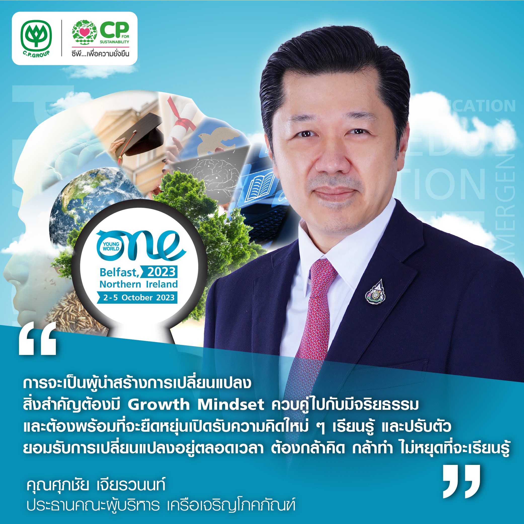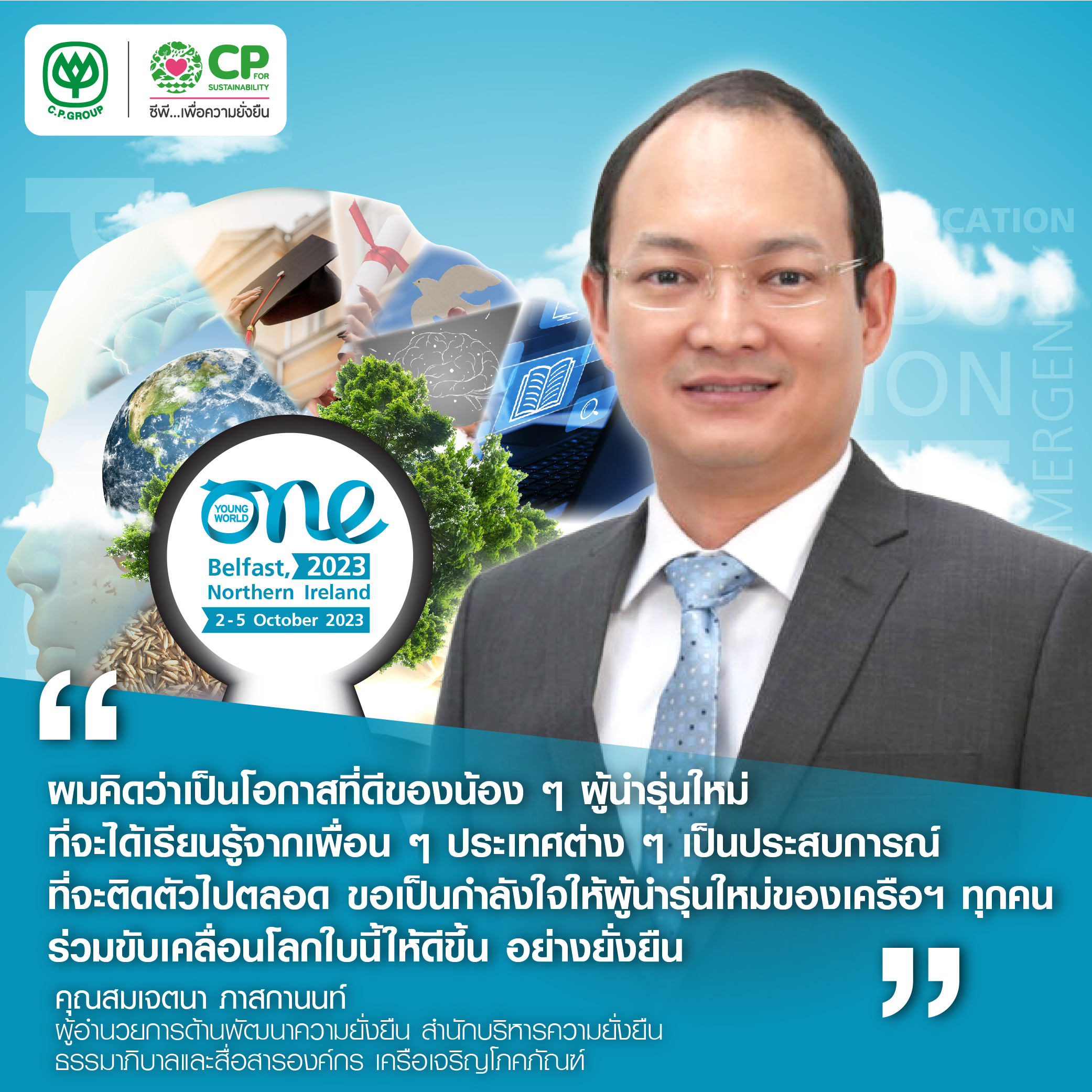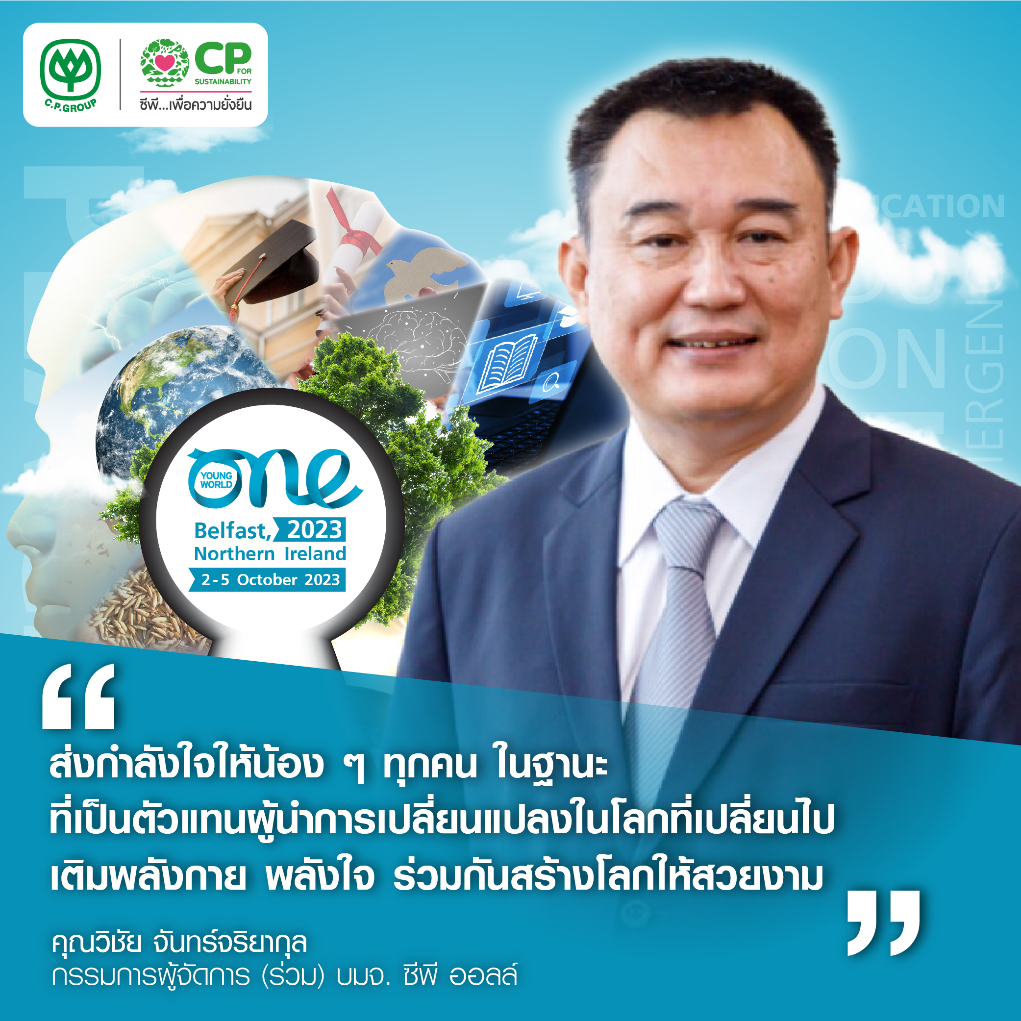 คุณศุภชัย เจียรวนนท์ ประธานคณะผู้บริหาร เครือเจริญโภคภัณฑ์ คุณมนัส เจียรวนนท์ ประธานคณะผู้บริหาร บริษัท เจียไต๋ จำกัด คุณธนิศร์ เจียรวนนท์ ประธานคณะผู้บริหาร ธุรกิจค้าส่งแม็คโครประเทศไทย คุณวิชัย  จันทร์จริยากุล กรรมการผู้จัดการ (ร่วม) บมจ.ซีพี ออลล์ คุณสมเจตนา ภาสกานนท์ ผู้อำนวยการด้านพัฒนาความยั่งยืน สำนักบริหารความยั่งยืน ธรรมาภิบาลและสื่อสารองค์กร เครือเจริญโภคภัณฑ์ และ ดร.เนตรชนก วิภาตะศิลปิน หัวหน้าสายงานกลยุทธ์  บมจ. ทรู คอร์ปอเรชั่น ร่วมส่งกำลังใจแก่ผู้นำรุ่นใหม่จำนวน 20 คน แสดงพลังบนเวทีโลก เสริมความรู้ความเข้าใจประเด็นปัญหา และความท้าทายที่ทั่วโลกกำลังเผชิญ ภายใต้แนวคิด ผู้นำการเปลี่ยนแปลงในโลกที่เปลี่ยนไป (GEN-US Future-Proof The World)’ บนเวที One Young World Summit 2023 ซึ่งจัดขึ้นระหว่างวันที่ 2-5 ตุลาคม 2566 ณ เมืองเบลฟาสต์ ประเทศไอร์แลนด์เหนือ