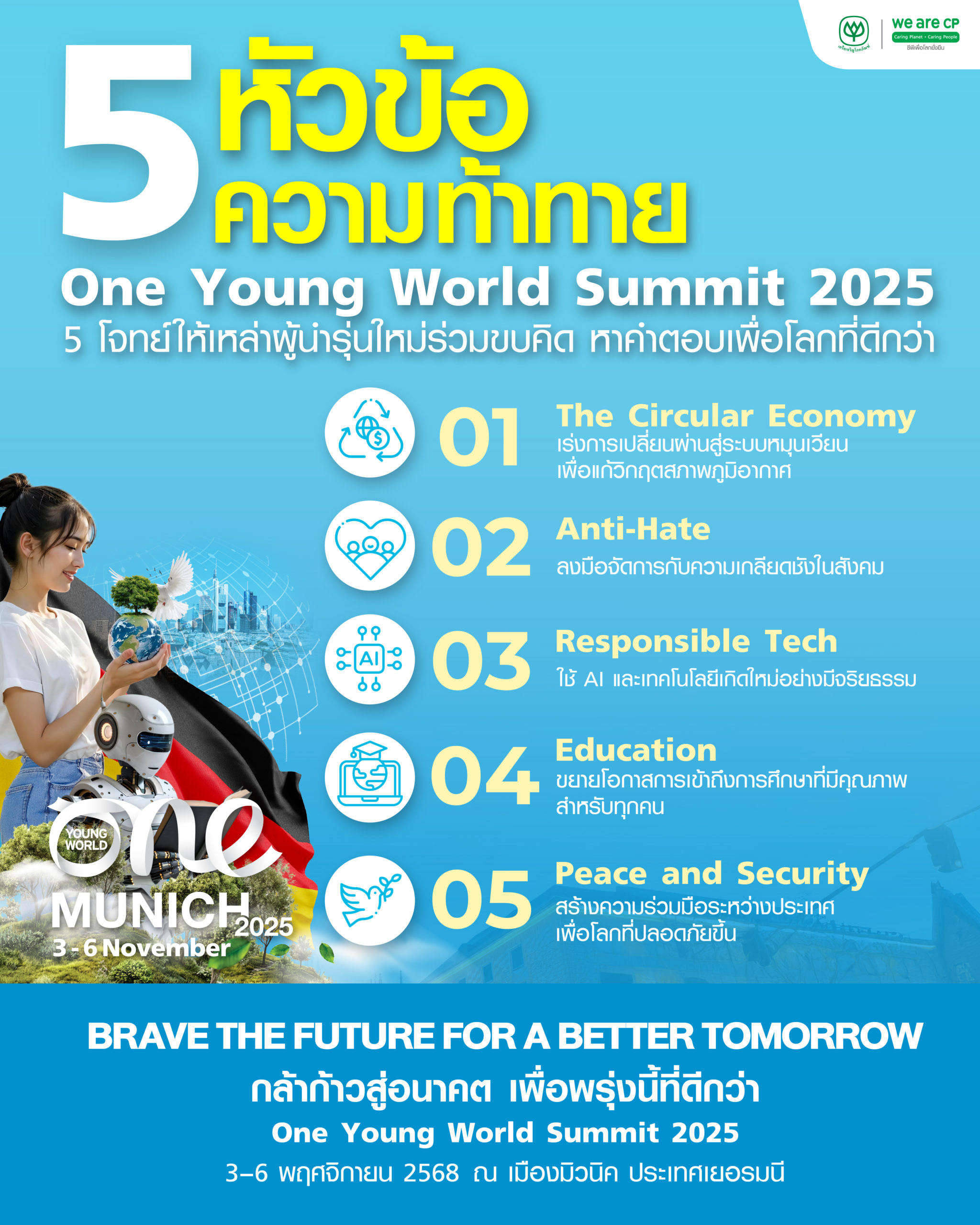 One Young World Summit 2025 การประชุมสุดยอดผู้นำเยาวชนที่ใหญ่ที่สุดในโลก ที่เปิดโอกาสให้เยาวชนคนรุ่นใหม่จากทั่วโลกกว่า 190 ประเทศได้นำเสนอแนวคิดและลงมือปฏิบัติในประเด็นปัญหาต่างๆ ที่โลกกำลังเผชิญอยู่เพื่อให้เกิดการเปลี่ยนแปลงไปในทางที่ดีขึ้น เครือเจริญโภคภัณฑ์ภายใต้การนำของ คุณศุภชัย เจียรวนนท์ ประธานคณะผู้บริหาร เครือเจริญโภคภัณฑ์ ได้มีนโยบายให้เครือฯ และกลุ่มบริษัทในเครือฯ ดำเนินโครงการ “ซีพีสานฝัน ปันโอกาส สู่ผู้นำรุ่นใหม่ One Young World” สนับสนุนส่งผู้นำคนรุ่นใหม่ 20 ท่านจากหลายกลุ่มธุรกิจในเครือฯ เป็นตัวแทนของประเทศไทยในการเข้าไปรับฟัง และแลกเปลี่ยนมุมมองความคิดที่สำคัญต่อการขับเคลื่อนโลกของเราให้ยั่งยืนบนเวทีผู้นำเยาวชนระดับโลกมาอย่างต่อเนื่องเป็นปีที่ 10 โดยในปีนี้ One Young World Summit 2025 จัดขึ้นระหว่างวันที่ 3–6 พฤศจิกายน 2568 ณ เมืองมิวนิค ประเทศเยอรมนี