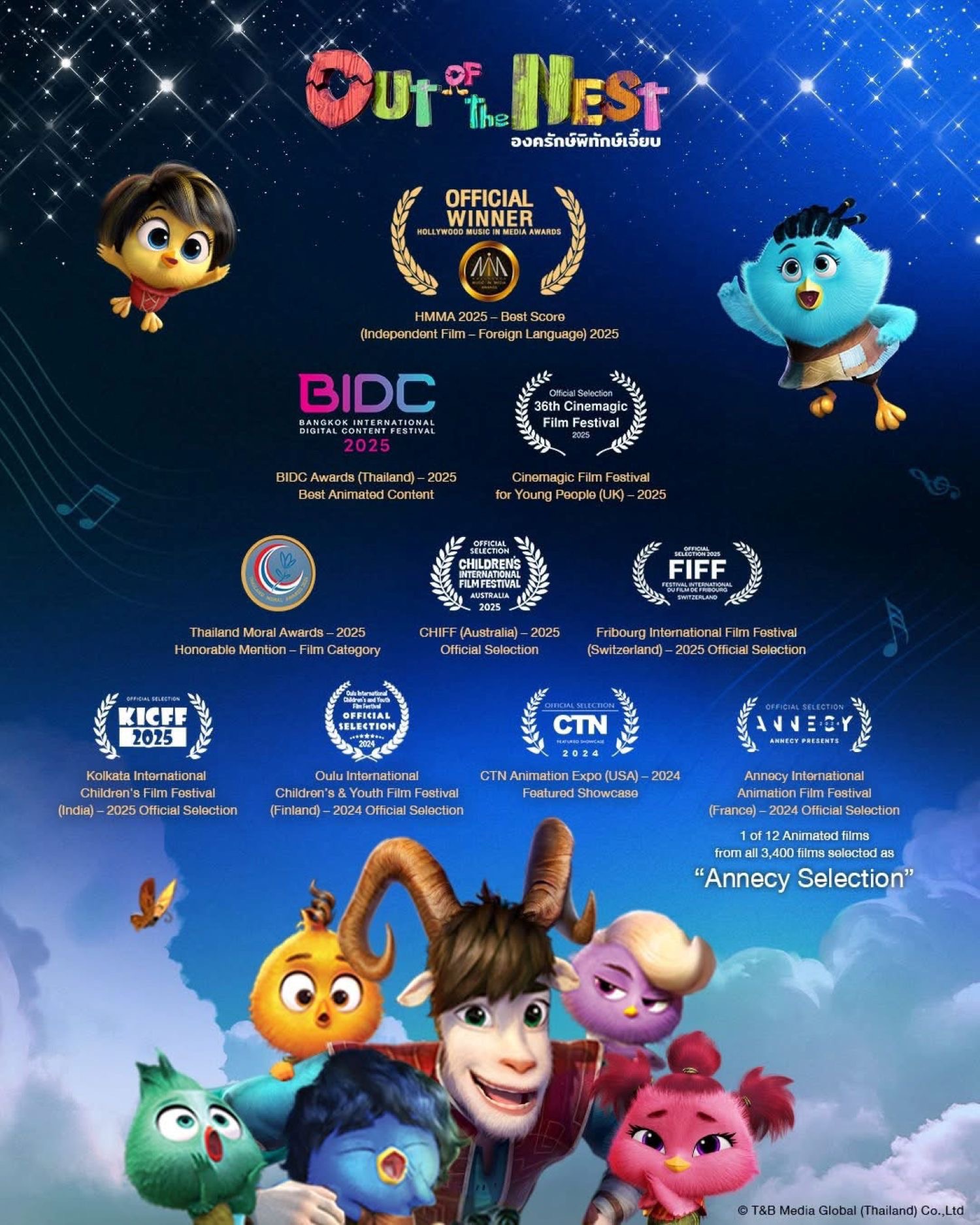 ตลอดระยะเวลากว่า 1 ปีของการเดินทาง “Out of the Nest” ได้รับการซื้อลิขสิทธิ์ไปฉายในกว่า 100 ประเทศทั่วโลก ทั้งในโรงภาพยนตร์และแพลตฟอร์มสตรีมมิง พร้อมสร้างชื่อเสียงด้วยรางวัลระดับนานาชาติรวมกว่า 9 รางวัล รวมถึงอีก 2 รางวัลจากเวทีในประเทศไทย ได้แก่ Bangkok International Digital Content Festival (BIDC) Awards 2025 และ Thailand Moral Awards 2025