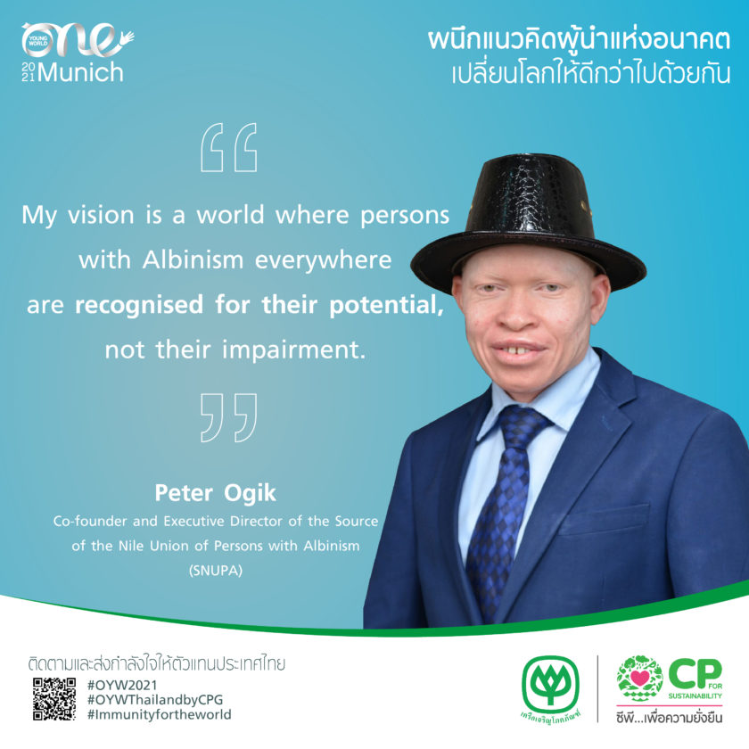 นอกจากนี้ ยังมี ปีเตอร์ โอกิค (Peter Ogik) ประธานคณะกรรมการและผู้ร่วมก่อตั้ง Source of the Nile Union of Persons with Albinism หรือ องค์กรไม่แสวงหาผลกำไรเพื่อช่วยเหลือผู้มีความผิดปกติทางพันธุกรรมที่เรียกว่า Albinism ซึ่งตัวเขาเองเกิดมาพร้อมกับ Albinism และได้เล่าถึงความยากลำบากในการใช้ชีวิตวัยเด็ก เช่น การเข้าสังคม การถูกเพื่อน ๆล้ อ ตลอดจนถูกปฏิเสธเข้ารับทำงานเมื่อเขาโตขึ้น ปีเตอร์ต้องการต่อสู้เพื่อสิทธิของคนที่เกิดมาพร้อมกับ Albinism เขาต้องการให้สังคมเข้าใจและยอมรับในความแตกต่าง เพราะเขาเชื่อในการต่อสู้เพื่อสิทธิในความแตกต่าง และทุกคนในสังคมควรได้รับโอกาสที่เท่าเทียมกัน