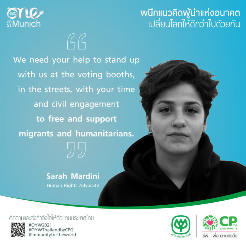 ด้านตัวแทนเยาวชนที่ได้รับเลือกให้มาพูดคุยบนเวทีดังระดับโลกอย่าง ซาราห์ มาร์ดินี (Sarah Mardini) นักเคลื่อนไหวทางสังคมชาวซีเรียที่ต่อสู้เพื่อสิทธิและเสรีภาพให้แก่ผู้ลี้ภัย ซาราห์ได้เล่าถึงประสบการณ์การลี้ภัยของตัวเอง ความยากลำบากของผู้ลี้ภัยที่ต้องการจะมีชีวิตที่ดีขึ้น เธอยังได้เล่าถึงเหตุการณ์ที่เธอถูกจับที่ประเทศกรีซ เนื่องจากการช่วยเหลือผู้ลี้ภัยให้เข้าประเทศอย่างปลอดภัย ซาราห์ถูกกล่าวหาว่าเป็นอาชญากรข้ามชาติ ลักลอบคนเข้าเมือง เพียงเพราะเธอต้องการช่วยเหลือเพื่อนมนุษย์ด้วยกัน ซาราห์ไม่เคยยอมแพ้และอุปสรรคต่าง ๆ ไม่ได้ทำให้เธอหยุดช่วยเหลือผู้ลี้ภัย เพราะเธอเชื่อในการต่อสู้เพื่อโลกที่ไร้พรมแดน ที่มนุษย์ทุกคนมีสิทธิและเสรีภาพในการใช้ชีวิตเท่าเทียมกัน