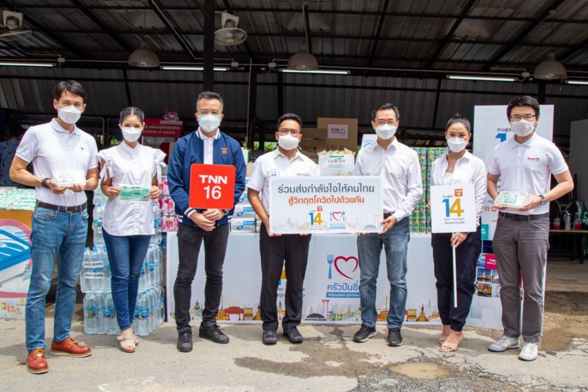 เดินหน้าอีกหนึ่งภารกิจเพื่อความดี TNN ฉลองก้าวสู่ปีที่ 14 ผนึกกำลังพันธมิตร ร่วมเคียงคู่สู้โควิด จัดสิ่งของที่จำเป็นต่อการยังชีพ เพื่อให้ความช่วยเหลือชุมชนที่ได้รับผลกระทบจากวิกฤตโควิด-19 โดยมีนายชื่นชอบ คงอุดม (ที่ 4 จากซ้าย) ผู้ช่วยรัฐมนตรีประจำกระทรวงการคลัง และที่ปรึกษามูลนิธิเตาปูน พร้อมด้วย นายองอาจ ประภากมล หัวหน้าคณะผู้บริหาร สายมีเดีย บมจ.ทรู คอร์ปอเรชั่น และกรรมการผู้จัดการ บริษัท ไทยนิวส์ เน็ตเวิร์ค จำกัด (TNN ช่อง 16) (ที่ 3 จากขวา) นำทีมผู้ประกาศข่าว นางสาวกมลพร วรกุล นายปิยลักษณ์ รักประทานพร นายชวัลน์ จันทร์ทรัพย์ และนางสาวรวิฌา ทังสุบุตร พร้อมคณะจิตอาสาทีมข่าว ร่วมกันมอบหน้ากากอนามัยกว่า 12,000 ชิ้น จาก บริษัท ทรู จีเอส จำกัด บริษัท เจริญโภคภัณฑ์อาหาร จำกัด (มหาชน) และบริษัท ไออาร์พีซี จำกัด (มหาชน), น้ำดื่มกว่า 3,000 ขวด จาก กรมทรัพยากรน้ำบาดาล, บริษัท ท่าอากาศยานไทย จำกัด, ธนาคารออมสิน, บริษัท ข้อมูลเครดิตแห่งชาติ จำกัด, บริษัท วายแอลจี บูลเลี่ยน อินเตอร์เนชั่นแนล จํากัด, ข้าวสาร 250 ถุง จากธนาคารเพื่อการเกษตรและสหกรณ์การเกษตร และบริษัท วายแอลจี บูลเลี่ยน อินเตอร์เนชั่นแนล จํากัด, ไข่ไก่ 5,000 ฟอง และน้ำดื่มวิตามินซี-วิท จำนวน 510 ขวด จากกระทรวงแรงงาน,ขนมปังเลอแปง จำนวน 500 ชิ้น จาก บริษัท ซีพีแรม จำกัด ตลอดจนบะหมี่กึ่งสำเร็จรูป และอาหารกระป๋อง จากบริษัท บ้านปู จำกัด, ธนาคารกสิกรไทย และธนาคารเพื่อการเกษตรและสหกรณ์การเกษตร รวมถึงสิ่งของจำเป็นแก่พี่น้องประชาชนในชุมชนต่างๆ ของพื้นที่เขตบางซื่อ ซึ่งเป็นหนึ่งในจุดส่งมอบอาหารของโครงการครัวปันอิ่ม ซีพีร้อยเรียงใจ สู้ภัยโควิด-19 ภายใต้การดูแลของกลุ่มทรู โดย TNN และมูลนิธิเตาปูน ซึ่งเป็นพันธมิตรในโครงการ ได้ร่วมกันส่งมอบอาหารปรุงสุกสดใหม่จากซีพีเอฟและร้านอาหารรายย่อยในชุมชนใกล้เคียง วันละ 1,000 กล่อง และหน้ากากอนามัยซีพี กระจายสู่ชุมชนต่างๆในพื้นที่เขตบางซื่ออย่างต่อเนื่องตั้งแต่ช่วงกลางเดือนสิงหาคม 2564 ที่ผ่านมา
