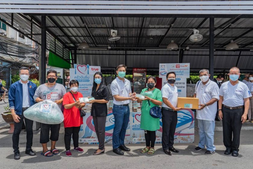 นางทิพวรรณ์ เจนประวิทย์ (ที่ 3 จากขวา) ผู้อำนวยการเขตบางซื่อ พร้อมด้วย มูลนิธิเตาปูน โดย นายชื่นชอบ คงอุดม (ที่ 3 จากซ้าย) ผู้ช่วยรัฐมนตรีประจำกระทรวงการคลัง และที่ปรึกษามูลนิธิ ร่วมกับ กลุ่มทรู นำโดย นายณัฐวุฒิ อมรวิวัฒน์ (กลาง) กรรมการผู้จัดการใหญ่ (ร่วม) บมจ. ทรู คอร์ปอเรชั่น และ นายอธิพล วงศ์สืบยุทธ์ (ซ้ายสุด) รองผู้อำนวยการฝ่ายข่าว สถานีข่าว TNN ส่งมอบอาหารปรุงสุก สดใหม่ และหน้ากากอนามัยซีพี ในโครงการ “ครัวปันอิ่ม ร้อยเรียงใจ สู้ภัยโควิด-19” ณ จุดแจกอาหารชุมชนบางซื่อ เพื่อช่วยบรรเทาทุกข์ เติมพลังสร้างความสุข ให้แก่พี่น้องในพื้นที่เขตบางซื่อที่มีจำนวนมากกว่า 80 ชุมชน