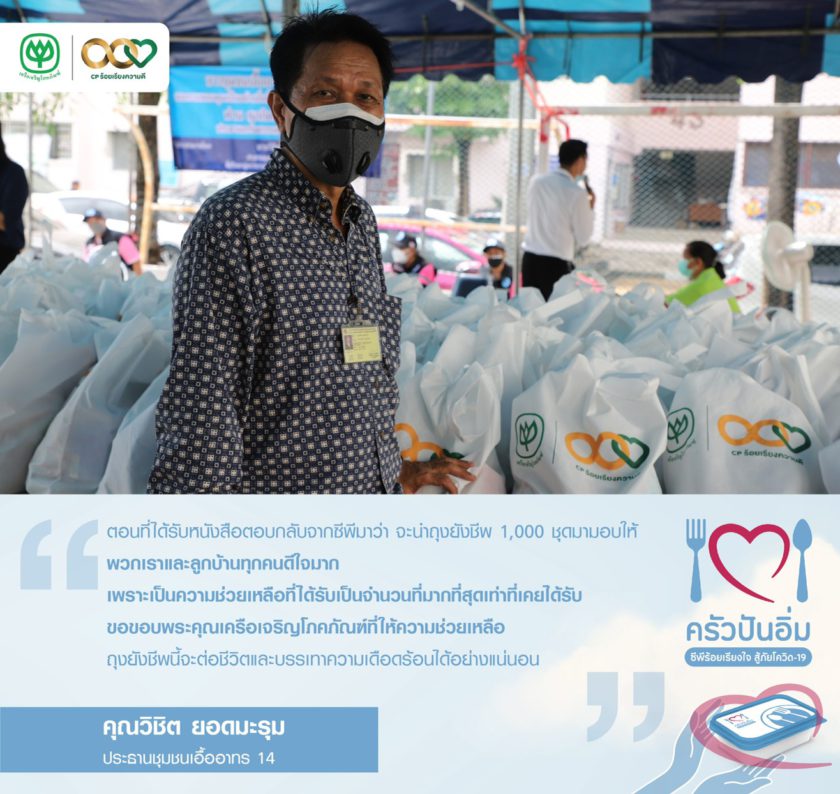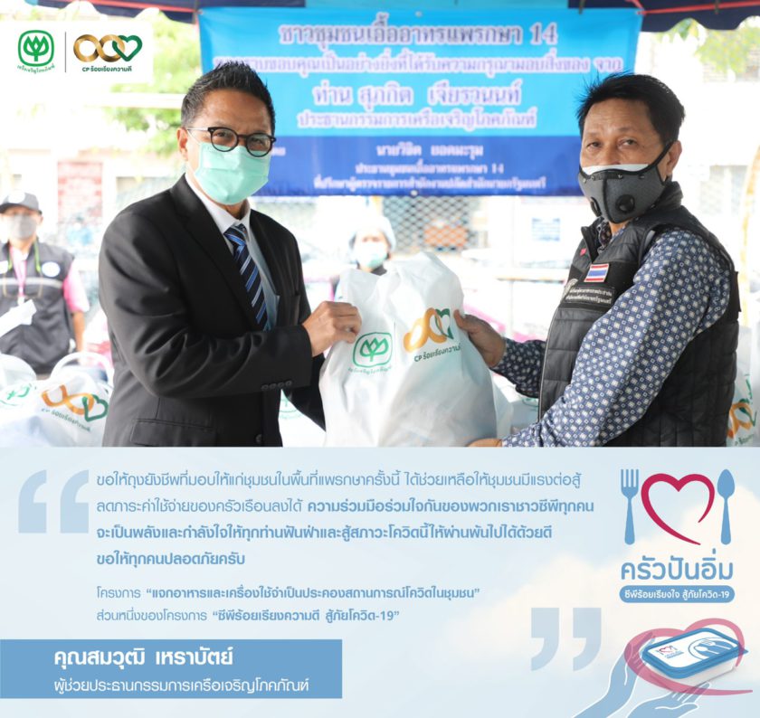 เป็นเสียงสะท้อนจากประธานชุมชนแพรกษา -14 คุณวิชิต ยอดมะรุม ที่ทำหนังสือขอความช่วยเหลือมายังซีพี ซึ่งเครือฯ โดยท่านประธานสุภกิต เจียรวนนท์ ประธานกรรมการเครือเจริญโภคภัณฑ์ ได้มอบหมายให้ คุณสมวุฒิ เหราบัตย์ ผู้ช่วยประธานกรรมการเครือฯ นำถุงยังชีพ ในโครงการ ครัวปันอิ่มซีพีร้อยเรียงใจสู้ภัยโควิดไปมอบให้ เมื่อเร็ว ๆ นี้