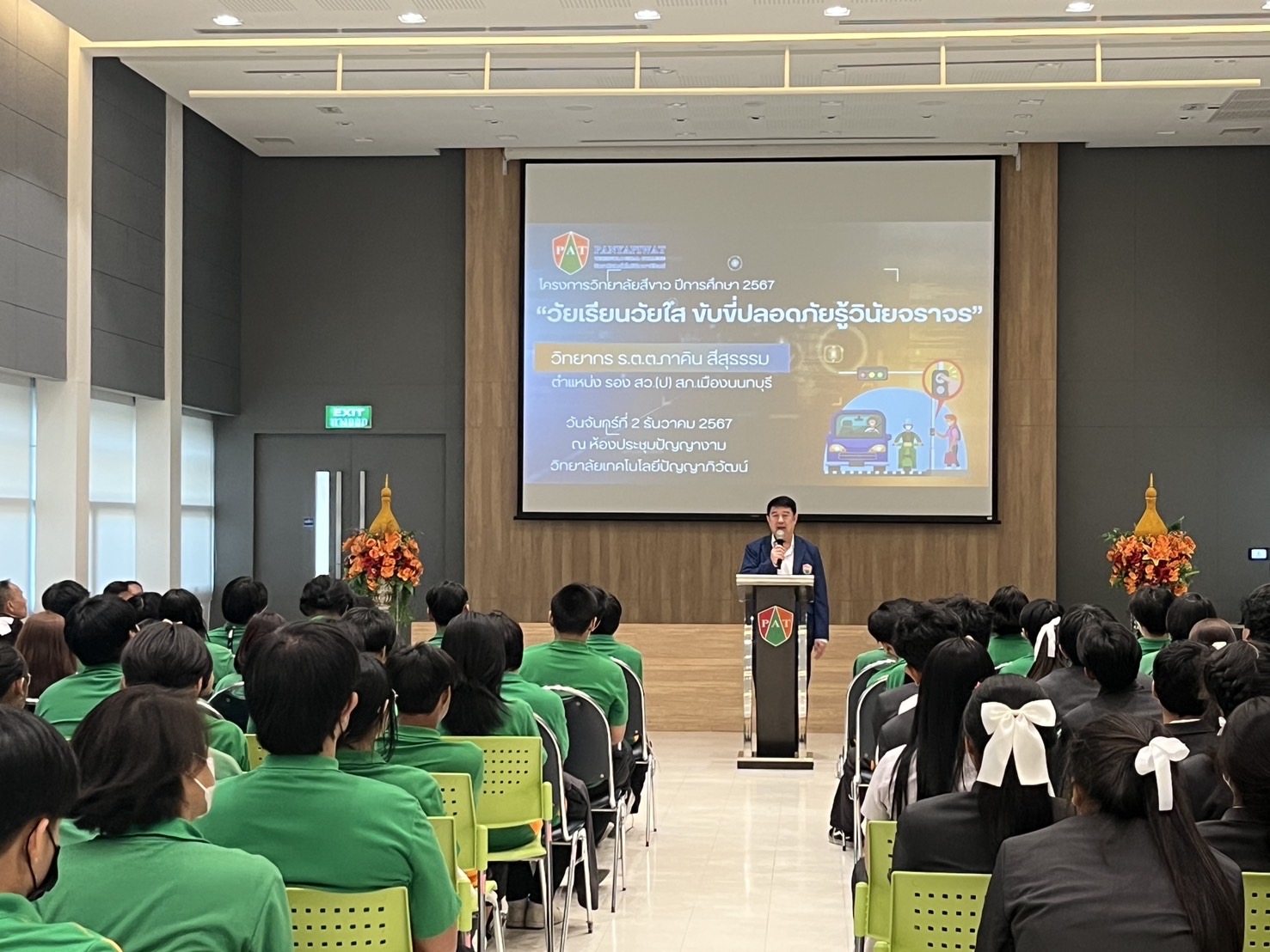 2 ธันวาคม 2567 วิทยาลัยเทคโนโลยีปัญญาภิวัฒน์ โดยนายอำนาจ อ้วนเจริญ ผู้อำนวยการสำนักกิจการนักเรียนนักศึกษา เป็นประธานในพิธีเปิดโครงการวิทยาลัยสีขาว ประจำปี 2567 ในหัวข้อ วัยเรียนวัยใส ขับขี่ปลอดภัยรู้วินัยจราจร และได้รับเกียรติจาก ร.ต.ต.ภาคิน สีสุธรรม รอง สว.(ป) สภ.เมืองนนทบุรี เป็นวิทยากร เพื่อสร้างความรู้ ความตระหนัก ปลูกจิตสำนึกให้แก่นักเรียน ในเรื่องของกฏหมายจราจร การรักษาวินัยในการขับขี่ การรู้จักป้องกันตนเองขณะขับขี่ยานพาหนะ และสร้างเครือข่ายนักเรียนในการรณรงค์ประชาสัมพันธ์ให้กับนักเรียนหรือเยาวชนคนอื่นๆ ในเรื่องของการป้องกันอุบัติเหตุจราจรต่อไป