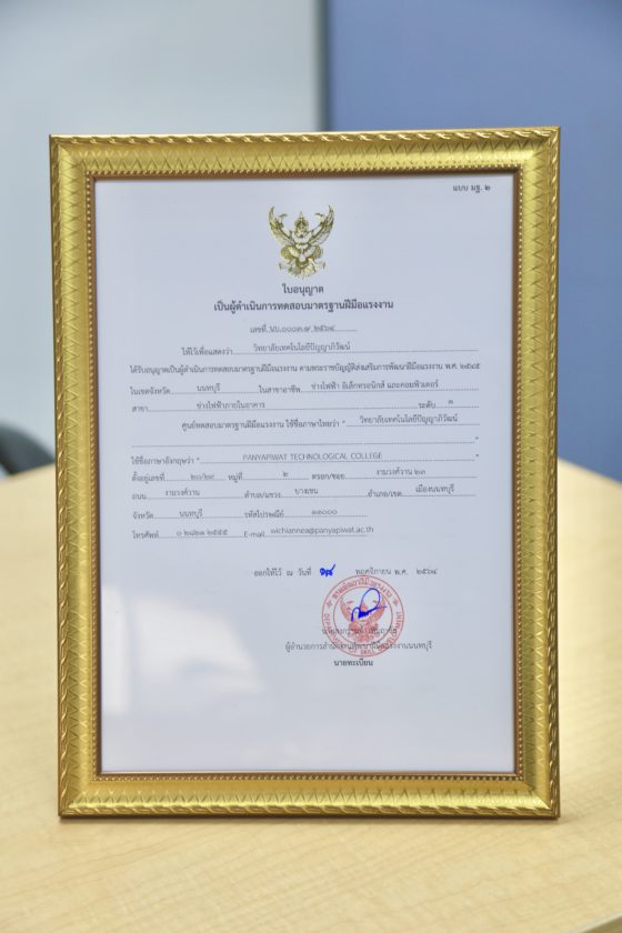 2 มีนาคม 2565 วิทยาลัยเทคโนโลยีปัญญาภิวัฒน์ นำโดยคุณวรเชษฐ์ ธรรมวงศ์ ผู้อำนวยการสำนักวิชาการ เป็นตัวแทนวิทยาลัยฯ เข้ารับใบอนุญาตเป็นผู้ดำเนินการทดสอบมาตรฐานฝีมือแรงงาน ตามพระราชบัญญัติส่งเสริมการพัฒนาฝีมือแรงงาน พุทธศักราช 2545 ในเขตจังหวัดนนทบุรี สาขาอาชีพช่างไฟฟ้า อิเล็กทรอนิกส์ และคอมพิวเตอร์ สาขาช่างไฟฟ้าภายในอาคาร โดยใช้ชื่อว่าศูนย์ทดสอบมาตรฐานฝีมือแรงงาน “วิทยาลัยเทคโนโลยีปัญญาภิวัฒน์”