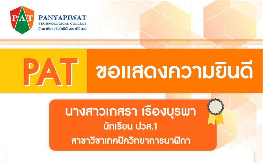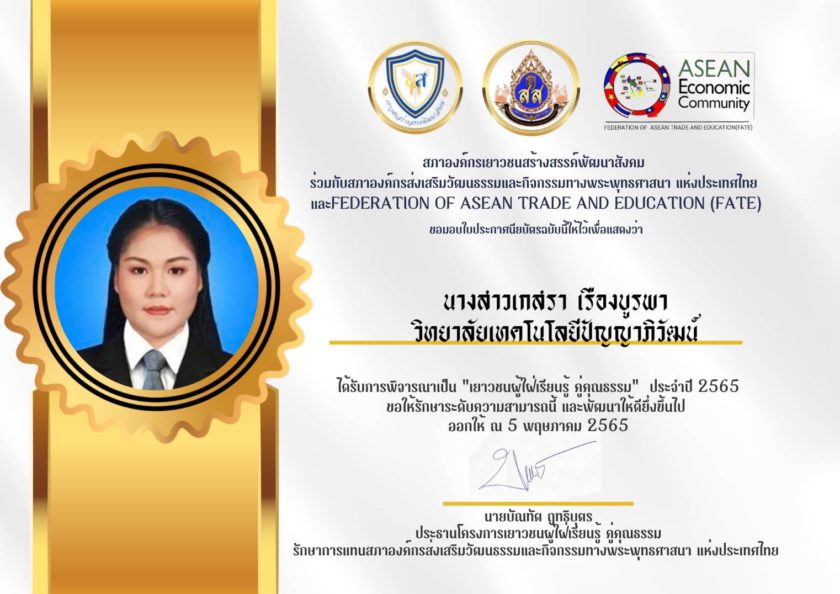 5 พฤษภาคม 2565 – นางสาวเกสรา เรืองบุรพา นักเรียนระดับประกาศนียบัตรวิชาชีพชั้นสูง (ปวส.1) สาขาวิชาเทคนิควิทยาการนาฬิกา วิทยาลัยเทคโนโลยีปัญญาภิวัฒน์ ได้รับการพิจารณาเป็น “เยาวชนผู้ใฝ่เรียนรู้ คู่คุณธรรม” ประจำปี 2565 จากสภาองค์กรเยาวชนสร้างสรรค์พัฒนาสังคม ร่วมกับสภาองค์กรส่งเสริมวัฒนธรรมและกิจกรรมทางพระพุทธศาสนา แห่งประเทศไทย และ FEDERATION OF ASEAN TRADE AND EDUCATION (FATE)