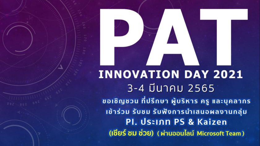 วิทยาลัยเทคโนโลยีปัญญาภิวัฒน์ โดยสำนักนโยบายและระบบคุณภาพ จัดกิจกรรม PAT Innovation Day ระหว่างวันที่ 3-4 มีนาคม 2565 เพื่อส่งเสริมให้ผู้บริหารและบุคลากร รวมพลังต่อยอดความรู้สู่การเป็นองค์กรคุณภาพ นำแนวคิด Quality Control Cycle พร้อมทั้งข้อเสนอแนะ แนวทางการพัฒนา ประสบการณ์ที่ได้รับจากการเสนอผลงาน PI. ประเภท Problem Solving หรือ PS และ ประเภท Kaizen มาประยุกต์ใช้ในกระบวนการทำงาน การปรับปรุงงานให้การดำเนินงานงานมีประสิทธิภาพและประสิทธิผล โดยมีนายวิเชียร เนียมน้อมผู้แทนผู้รับใบอนุญาตและผู้อำนวยการวิทยาลัยฯ เป็นประธานเปิดกิจกรรม