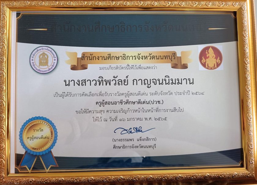 1. คุณทิพวัลย์ กาญจนนิมมาน ครูแผนกวิชาธุรกิจค้าปลีก ได้รับรางวัลครูผู้สอนดีเด่น ระดับจังหวัด ประจำปี 2564 “ครูผู้สอนอาชีวศึกษาดีเด่น (ปวช.)”