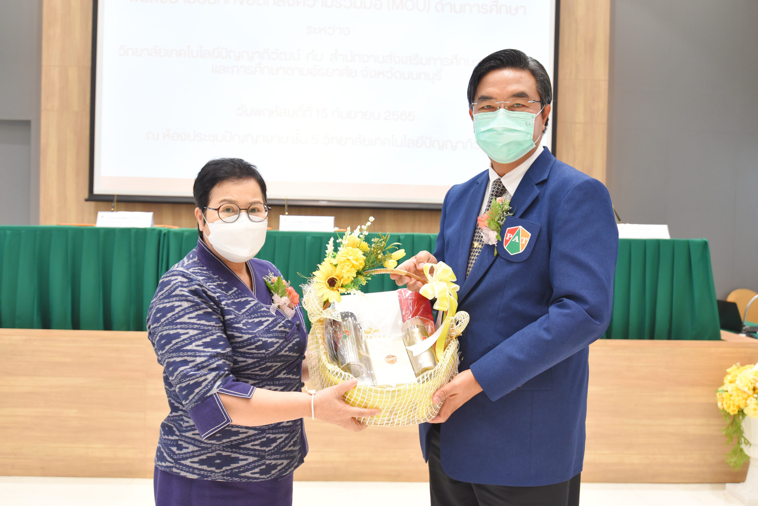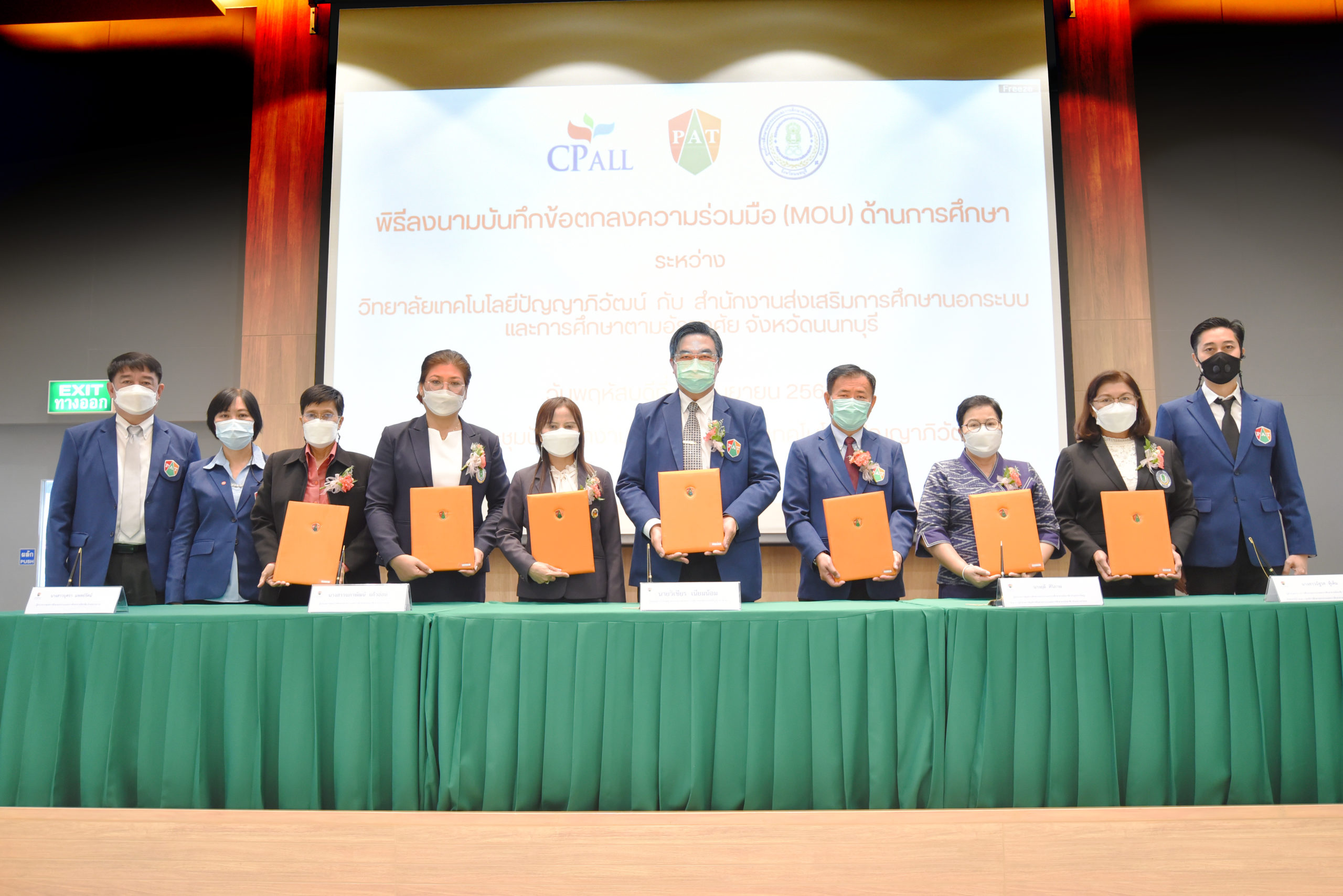 15 กันยายน 2565 วิทยาลัยเทคโนโลยีปัญญาภิวัฒน์ ร่วมกับสำนักงานส่งเสริมการศึกษานอกระบบและการศึกษาตามอัธยาศัย จังหวัดนนทบุรี ร่วมลงนามบันทึกข้อตกลงความร่วมมือ (MOU) ด้านการศึกษา เพื่อสร้างความร่วมมือโดยการจัดการอาชีวศึกษาแก่ชุมชน มุ่งเน้นการสร้างโอกาสทางการศึกษาที่หลากหลาย ดำเนินการสนับสนุนการศึกษาให้กับนักเรียน กศน.ให้ได้รับโอกาสทางการศึกษาอย่างเท่าเทียม พร้อมสนับสนุนความร่วมมือในการสร้างองค์ความรู้ฝ่ายการจัดกิจกรรมบริการวิชาการวิชาชีพ ให้แก่หน่วยงานและสถานศึกษา เป็นต้น