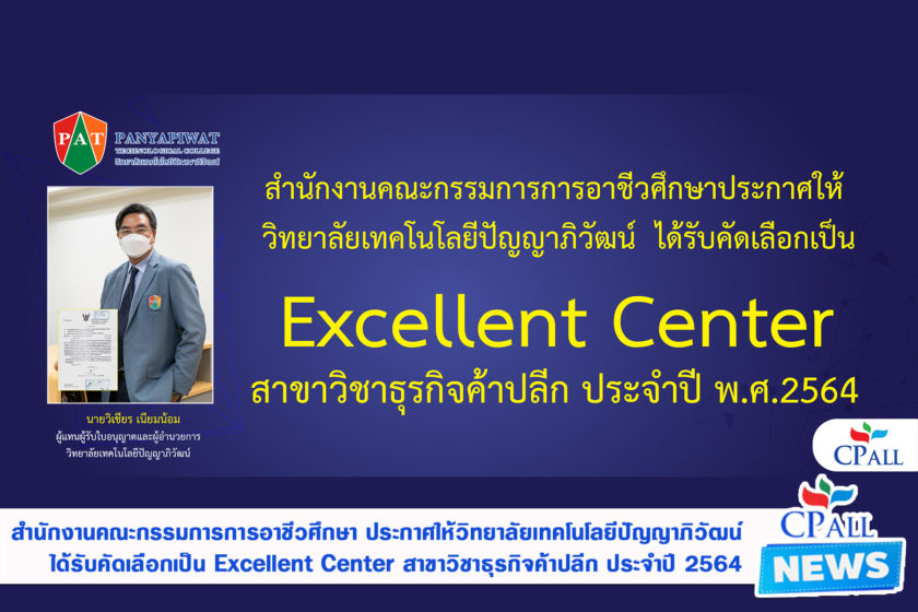 สำนักงานคณะกรรมการการอาชีวศึกษา ประกาศให้วิทยาลัยเทคโนโลยีปัญญาภิวัฒน์ (PAT) สถาบันการศึกษาเพื่อสังคมในกลุ่มซีพี ออลล์ สถานศึกษาที่เป็นผู้นำทางด้านทวิภาคี สาขาวิชาธุรกิจค้าปลีก ได้รับคัดเลือกผ่านเกณฑ์มาตรฐานเป็นสถานศึกษาในโครงการพัฒนาศูนย์ความเป็นเลิศทางการอาชีวศึกษา หรือ Excellent Center ประจำปี 2564 สอดคล้องกับดำเนินงานโครงการพัฒนาศูนย์ความเป็นเลิศทางการอาชีวศึกษา ด้านการผลิตและพัฒนากำลังคนให้มีทักษะและความเชี่ยวชาญเฉพาะทางสอดคล้องกับการพัฒนาอุตสาหกรรมเป้าหมายของประเทศ ตามนโยบายประเทศไทย 4.0 เพื่อความเหมาะสมกับยุทธศาสตร์การพัฒนาเชิงพื้นที่ เพิ่มศักยภาพและความสามารถในการแข่งขันของประเทศ