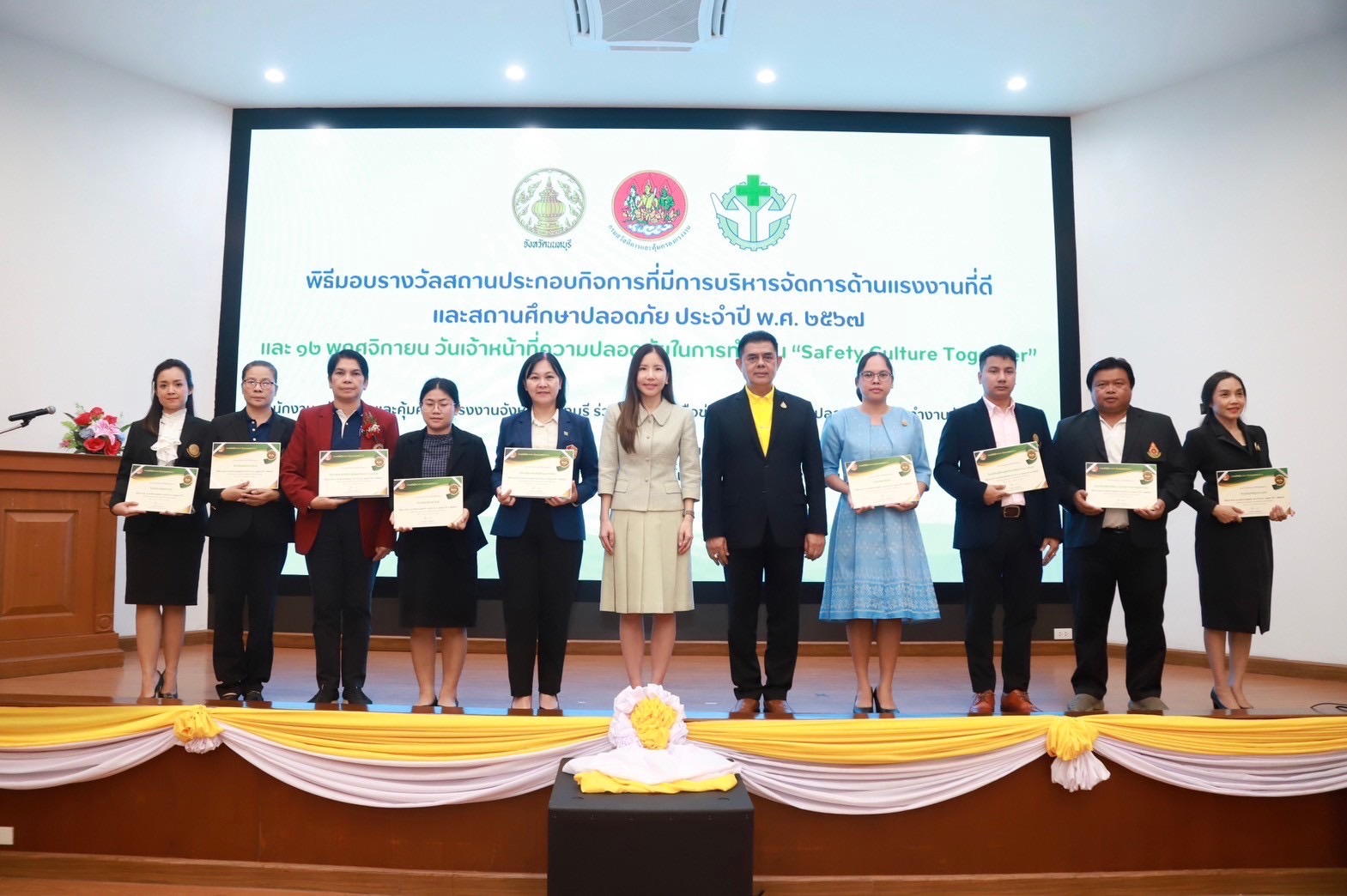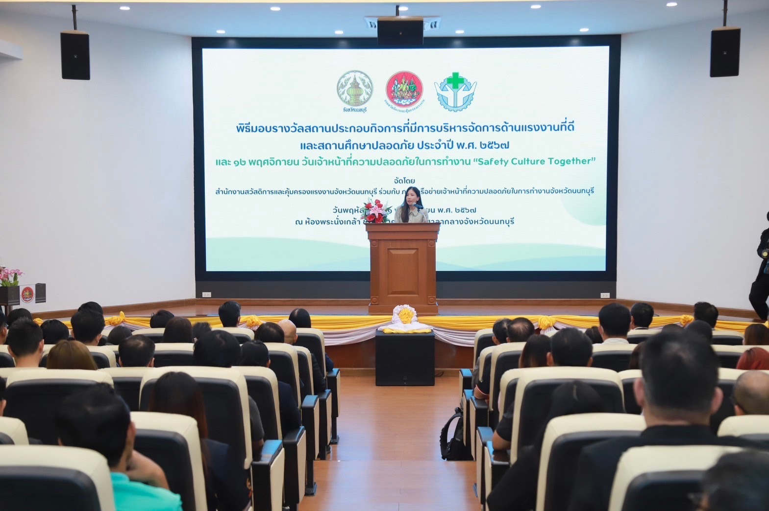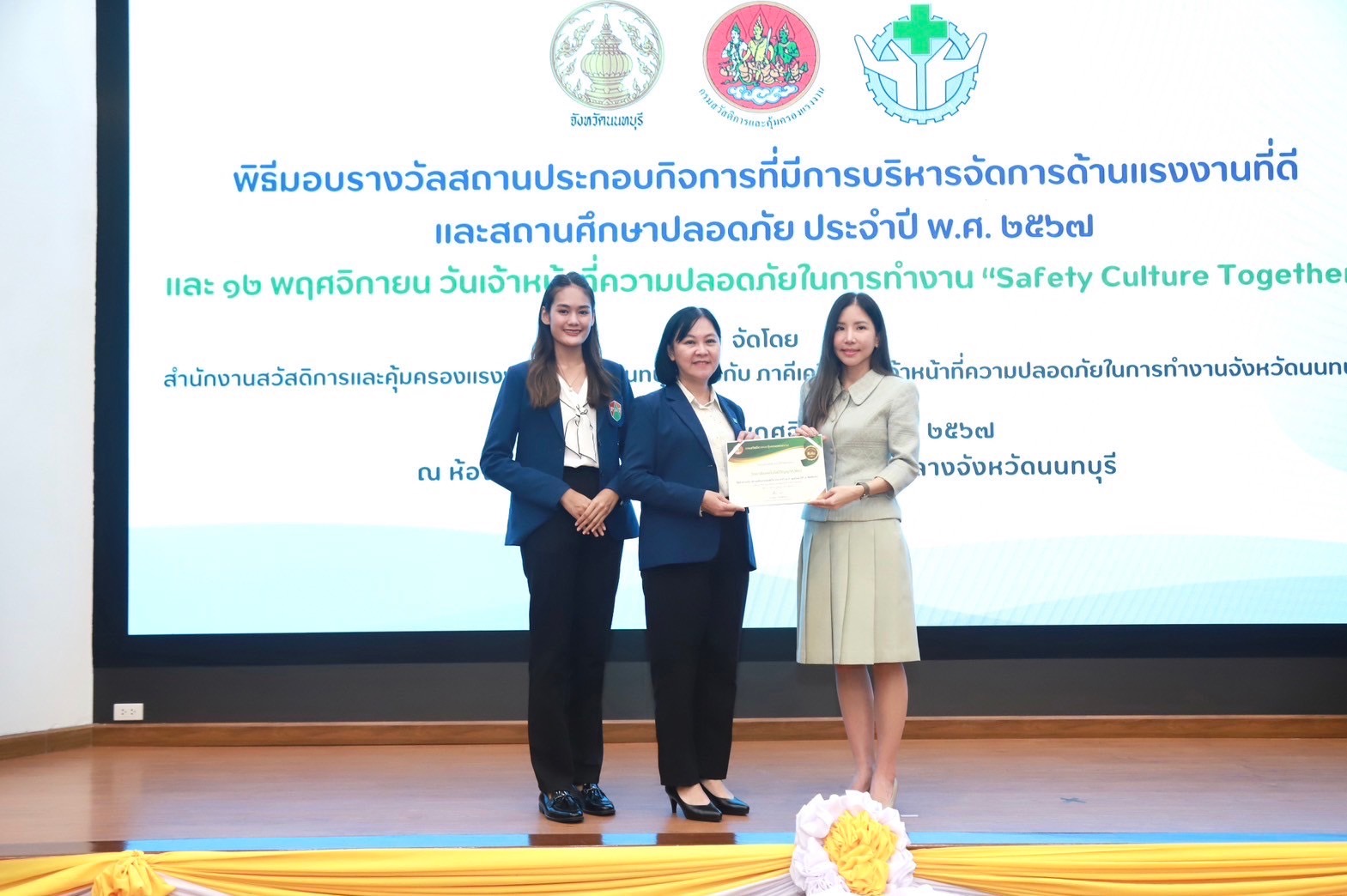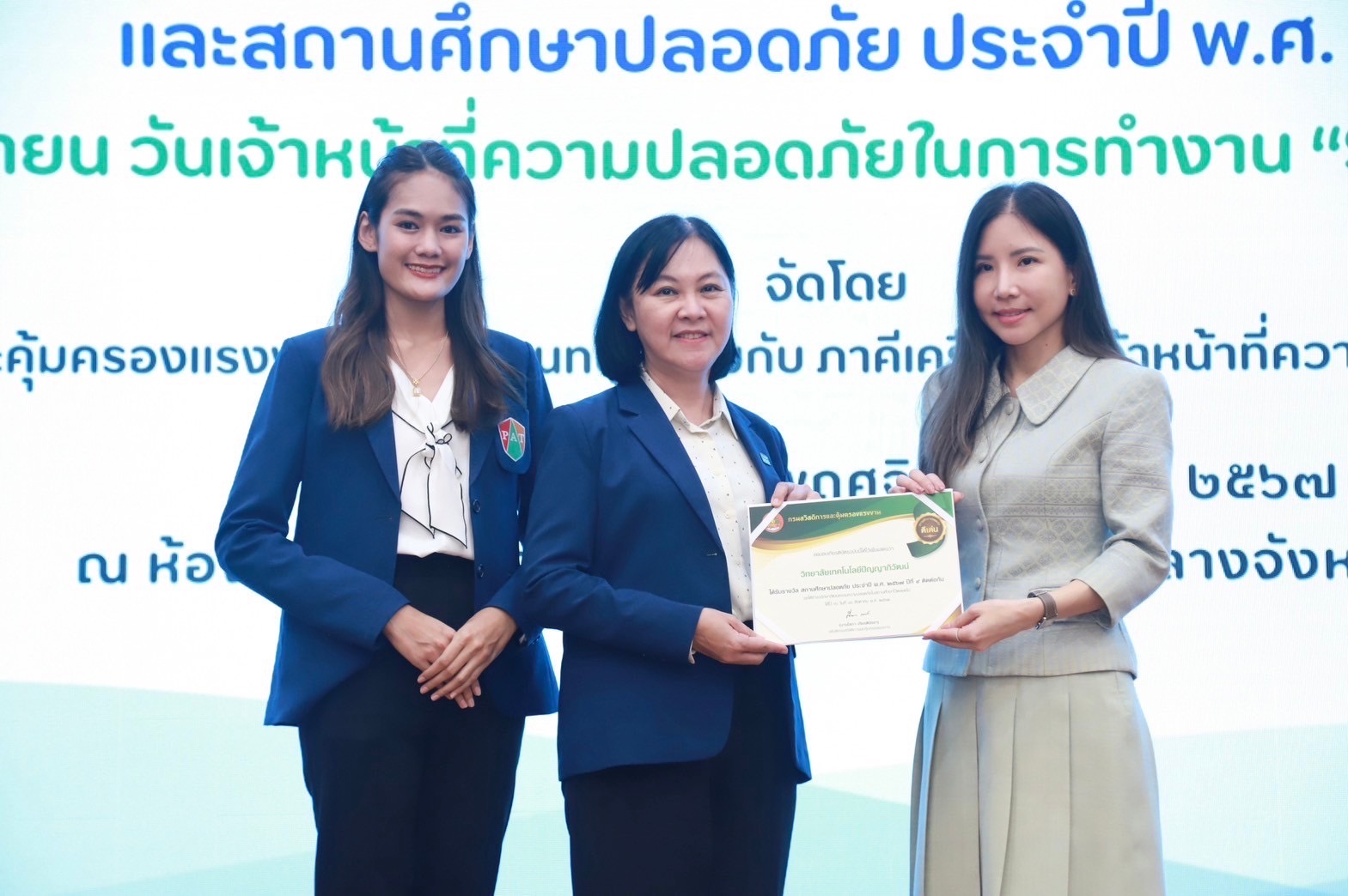 21 พฤศจิกายน 2567 วิทยาลัยเทคโนโลยีปัญญาภิวัฒน์ โดยนางสุจินดา หิรัญสิริสวัสดิ์ ผู้อำนวยการสำนักนโยบายและระบบคุณภาพ รับรางวัล “สถานศึกษาปลอดภัยดีเด่น ประจำปี 2567” จากกรมสวัสดิการและคุ้มครองแรงงาน กระทรวงแรงงาน ณ ศาลากลางจังหวัดนนทบุรี โดยได้รับเกียรติจากนางสาวปาณิสรา กาญจนะจิตรา รองผู้ว่าราชการจังหวัดนนทบุรี เป็นประธานมอบรางวัล โดยวิทยาลัยเทคโนโลยีปัญญาภิวัฒน์ได้รับรางวัลเกียรติบัตรดีเด่น สถานศึกษาปลอดภัย ประจำปีพุทธศักราช 2559 ถึงปีพุทธศักราช 2567 ต่อเนื่อง 9 ปีติดต่อกัน ซึ่งนับเป็นเครื่องหมายการันตีและแสดงให้เห็นว่าวิทยาลัยฯ และศูนย์การเรียนปัญญาภิวัฒน์ เป็นหนึ่งในสถานศึกษาต้นแบบที่ดี ในการสร้างจิตสำนึกและมุ่งสร้างวัฒนธรรมความปลอดภัยให้เกิดขึ้นในสถานศึกษาอย่างเป็นรูปธรรม ผ่านการเผยแพร่ความรู้ ความเข้าใจเกี่ยวกับมาตรการเชิงป้องกันด้านความปลอดภัย อาชีวอนามัยและสภาพแวดล้อมในการทำงานให้แก่นักเรียนนักศึกษา บุคลากรทุกคนภายในสถานศึกษา เพื่อให้เกิดความปลอดภัยกับชีวิตและทรัพย์สินของทุกคน ตามแนวทางการขับเคลื่อนความปลอดภัยและอาชีวอนามัยของประเทศไทย {Safety Thailand} และในโอกาสนี้ประธานในพิธี ได้แสดงความยินดีกับสถานศึกษาที่ได้รับรางวัลและจัดการบริหารความปลอดภัยอย่างต่อเนื่อง ซึ่งเป็นต้นน้ำสำคัญในการผลิตบุคลากรและยุวแรงงานที่มีคุณภาพให้กับประเทศอย่างยั่งยืน