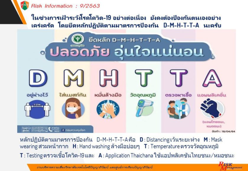 อย่างไรก็ตามขอให้ยึดหลักปฏิบัติตามมาตรการ D-M-H-T-T-A อย่างเคร่งครัด ได้แก่ D-Distancing การเว้นระยะห่าง M- Mask wearing การสวมใส่หน้ากากอนามัยตลอดเวลา H-Hand washing การล้างมือบ่อยๆ T-Temperature การตรวจวัดอุณหภูมิ T- Testing การตรวจเชื่อโควิด-19 และ A-Application Thaichana การใช้แอปพลิเคชั่นไทยชนะ/หมอชนะ