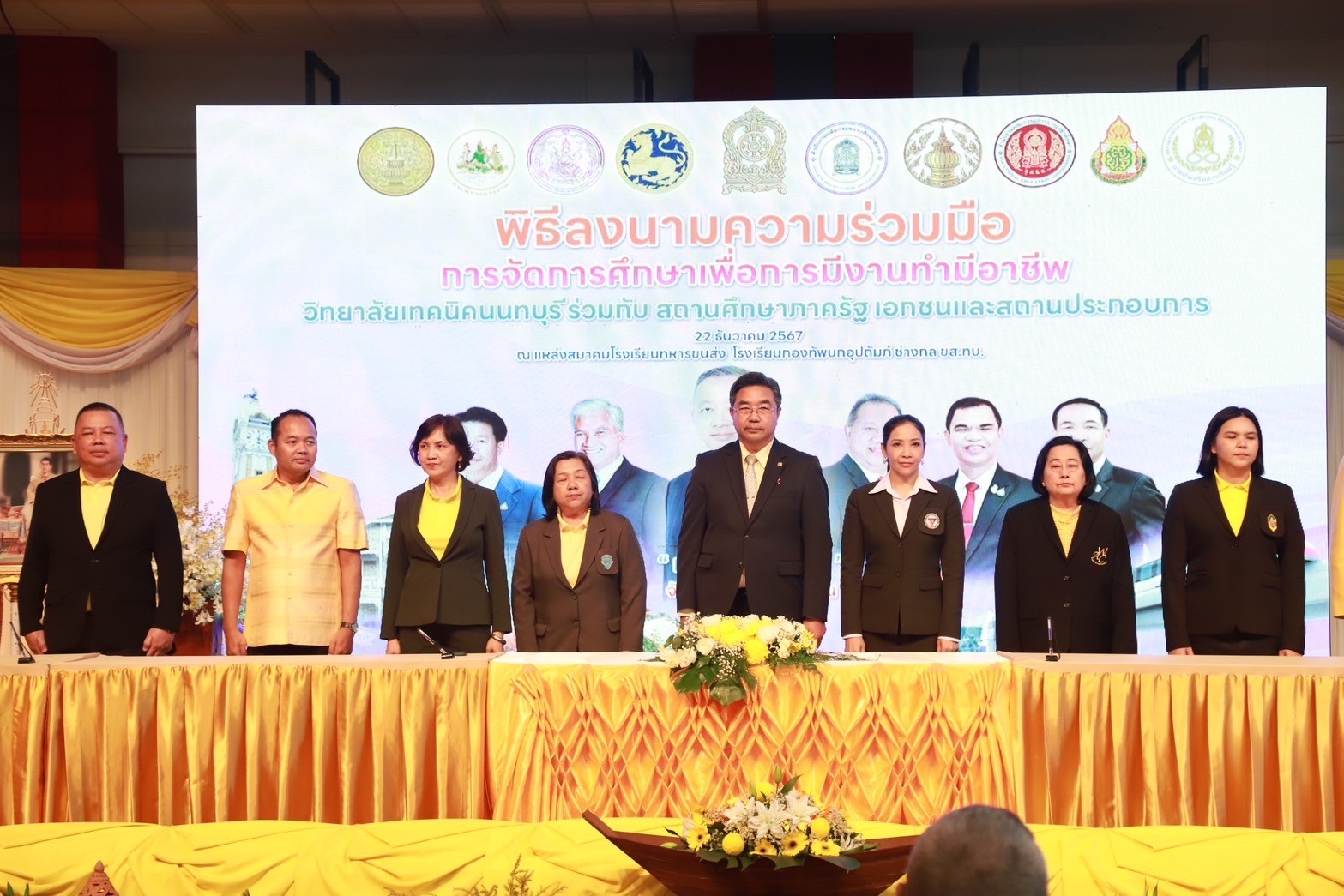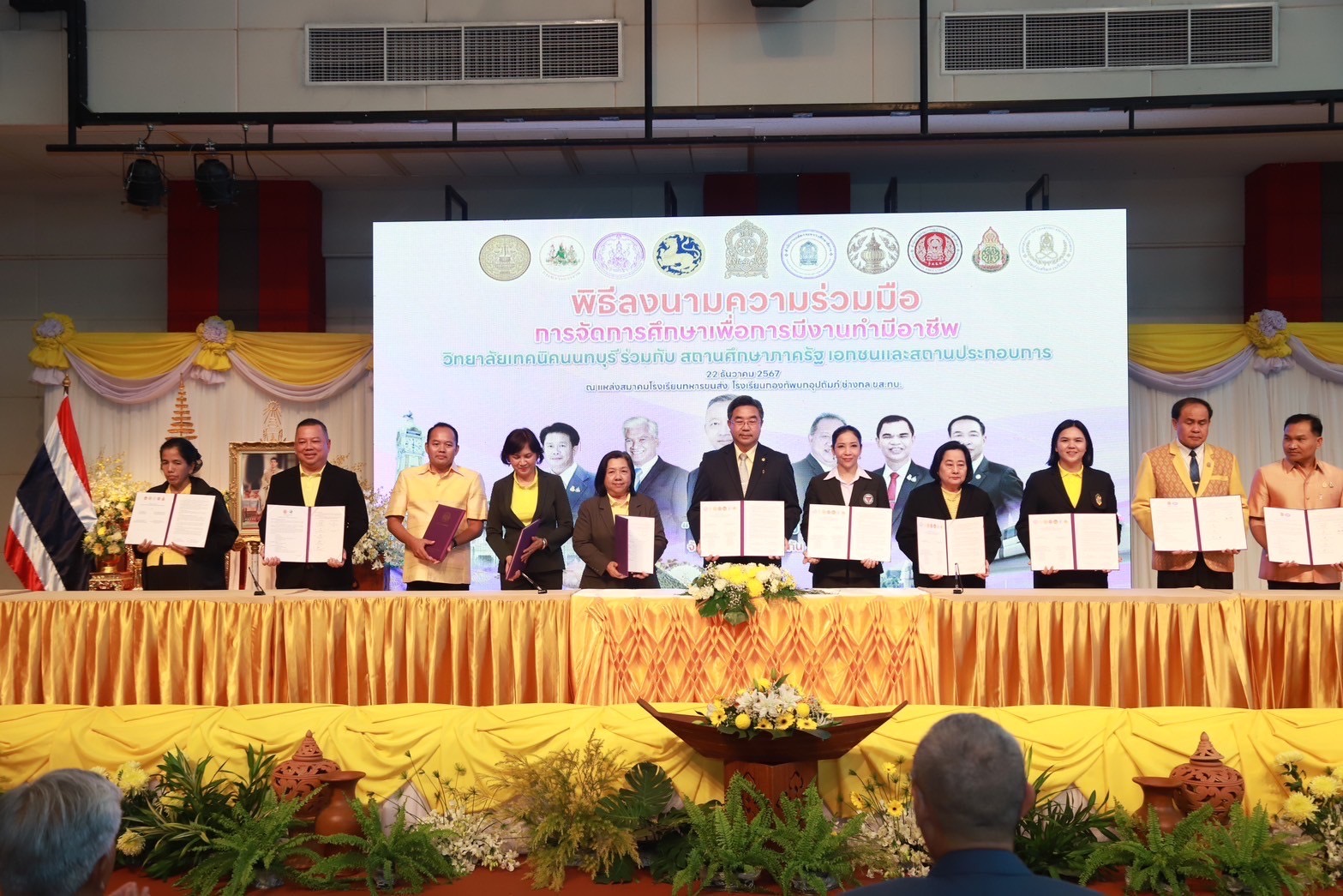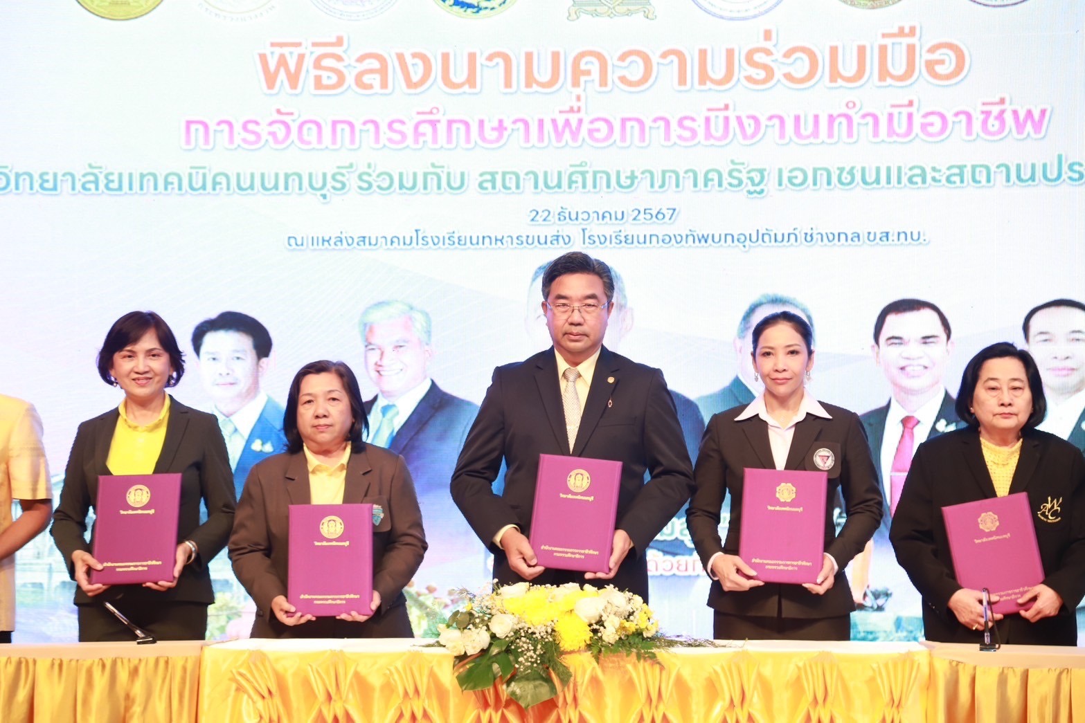 วันที่ 22 ธันวาคม 2567 เวลา 16.00 น. ณ แหล่งสมาคมโรงเรียนทหารขนส่ง (โรงเรียนกองทัพบกอุปถัมภ์ ช่างกล ขส.ทบ.) วิทยาลัยเทคโนโลยีปัญญาภิวัฒน์ โดย นายวิเชียร เนียมน้อม ผู้แทนผู้รับใบอนุญาตและผู้อำนวยการวิทยาลัยฯ ร่วมลงนามบันทึกข้อตกลงความร่วมมือการจัดการเรียนการสอนห้องเรียนอาชีพในสถานศึกษาระดับมัธยมศึกษา ในงาน “มหกรรมการจัดการศึกษาเพื่อการมีงานทำมีอาชีพ เฉลิมพระเกียรติพระบาทสมเด็จพระเจ้าอยู่หัว เนื่องในโอกาสมหามงคลเฉลิมพระชนมพรรษา 6 รอบ” โดยได้รับเกียรติจาก พลตำรวจเอกเพิ่มพูน ชิดชอบ รัฐมนตรีว่าการกระทรวงศึกษาธิการ เป็นประธาน นายเกียรติศักดิ์ ตรงศิริ ผู้ว่าราชการจังหวัดนนทบุรี กล่าวต้อนรับ นายยศพล เวณุโกเศศ เลขาธิการคณะกรรมการการอาชีวศึกษา (เลขาธิการ กอศ.) กล่าวรายงานการดำเนินงาน นายสุเทพ แก่งสันเทียะ ปลัดกระทรวงศึกษาธิการ ผู้แทน เลขาธิการคณะกรรมการการศึกษาขั้นพื้นฐาน ผู้แทนอธิบดีกรมส่งเสริมการเรียนรู้ ผู้บริหารสถานประกอบการ ศึกษาธิการจังหวัด ผู้อำนวยการสำนักงานเขตพื้นที่การศึกษามัธยมศึกษา และประถมศึกษา นายอำเภอ ผู้นำท้องถิ่น หน่วยงานที่เกี่ยวข้องทั้งภาครัฐและภาคเอกชน และคณะผู้บริหารสถานศึกษา ครูอาจารย์ นักเรียน นักศึกษา ร่วมพิธี เพื่อเป็นการเฉลิมพระเกียรติพระบาทสมเด็จพระเจ้าอยู่หัว ที่ทรงพระราชทาน พระบรมราโชบายด้านการศึกษา ความว่า “การศึกษาต้องมุ่งสร้างพื้นฐานให้แก่ผู้เรียน 4 ด้าน อันประกอบด้วย มีทัศนคติที่ถูกต้องต่อบ้านเมือง มีพื้นฐานชีวิตที่มั่นคงมีคุณธรรม การมีงานทำมีอาชีพ และ เป็นพลเมืองที่ดี”