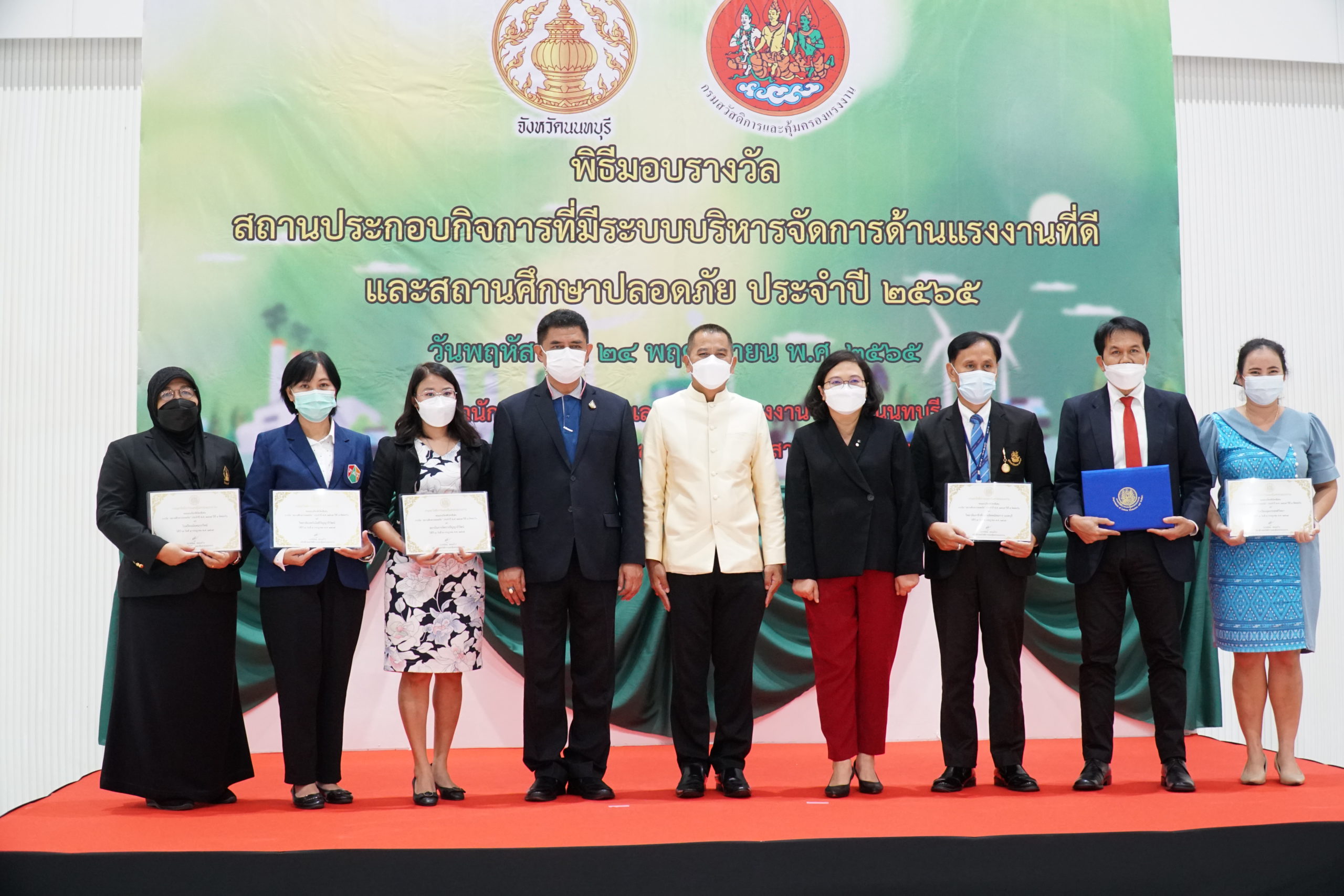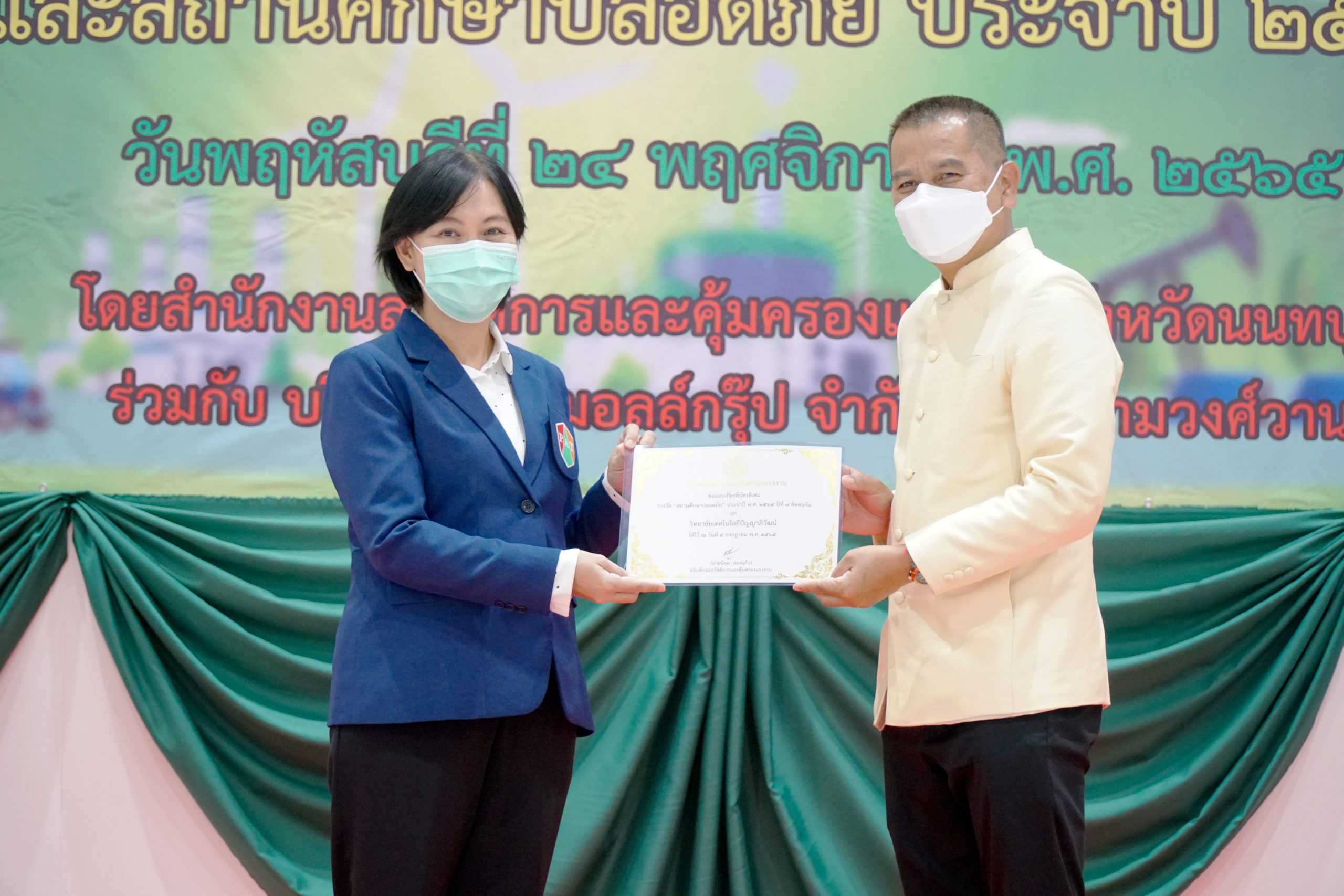 24 พฤศจิกายน 2565 วิทยาลัยเทคโนโลยีปัญญาภิวัฒน์ โดยคุณสุจินดา หิรัญสิริสวัสดิ์ ผู้อำนวยการสำนักนโยบายและระบบคุณภาพ รับรางวัล “สถานศึกษาปลอดภัยดีเด่น ประจำปี 2565” จากกรมสวัสดิการและคุ้มครองแรงงาน กระทรวงแรงงาน ณ ห้างสรรพสินค้าเดอะมอลล์ ไลฟ์สโตร์ งามวงศ์วาน โดยได้รับเกียรติจากคุณราชันย์ ซุ้นหั้ว รองผู้ว่าราชการจังหวัดนนทบุรี เป็นประธานมอบรางวัล โดยวิทยาลัยเทคโนโลยีปัญญาภิวัฒน์ได้รับรางวัลเกียรติบัตรดีเด่น สถานศึกษาปลอดภัย ประจำปีพุทธศักราช 2559 ถึงปีพุทธศักราช 2565 ต่อเนื่อง 7 ปีติดต่อกัน ซึ่งนับเป็นเครื่องหมายการันตีและแสดงให้เห็นว่าวิทยาลัยฯ และศูนย์การเรียนปัญญาภิวัฒน์ เป็นหนึ่งในสถานศึกษาต้นแบบที่ดี ในการสร้างจิตสำนึกและมุ่งสร้างวัฒนธรรมความปลอดภัยให้เกิดขึ้นในสถานศึกษาอย่างเป็นรูปธรรม ผ่านการเผยแพร่ความรู้ ความเข้าใจเกี่ยวกับมาตรการเชิงป้องกันด้านความปลอดภัย อาชีวอนามัยและสภาพแวดล้อมในการทำงานให้แก่นักเรียนนักศึกษา บุคลากรทุกคนภายในสถานศึกษา เพื่อให้เกิดความปลอดภัยกับชีวิตและทรัพย์สินของทุกคน ตามแนวทางการขับเคลื่อนความปลอดภัยและอาชีวอนามัยของประเทศไทย (Safety Thailand) และในโอกาสนี้ประธานในพิธี ได้แสดงความยินดีกับสถานศึกษาที่ได้รับรางวัลและจัดการบริหารความปลอดภัยอย่างต่อเนื่อง ซึ่งเป็นต้นน้ำสำคัญในการผลิตบุคลากรและยุวแรงงานที่มีคุณภาพให้กับประเทศอย่างยั่งยืน