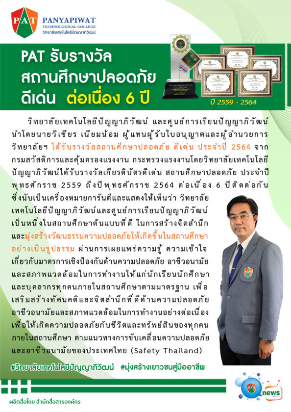 PAT รับรางวัล สถานศึกษาปลอดภัย ดีเด่น ต่อเนื่อง 6 ปี