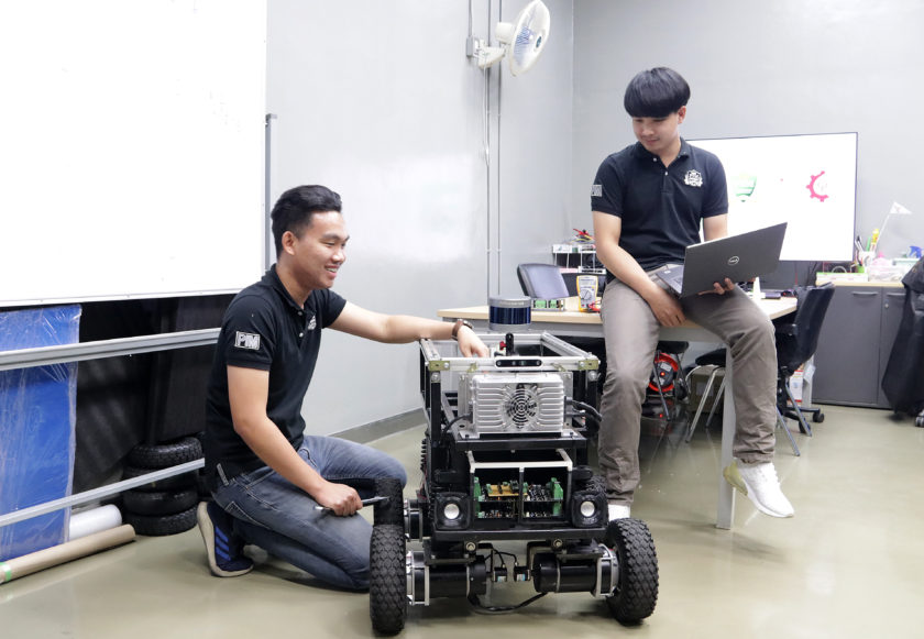 ด้านระบบการทำงานของหุ่นสร้างสรรค์โดย Specialist Engineer (CAD/CAM Design + Electronic) เจ้าหน้าที่ศูนย์ความเป็นเลิศทางนวัตกรรมและสิ่งประดิษฐ์ บัณฑิตป้ายแดงจากคณะวิศวกรรมศาสตร์และเทคโนโลยี พีไอเอ็ม ได้แก่ “เบส” นายธิติวุฒิ พิมพิสัย ควบคุมเซิร์ฟเวอร์ทั้งหมด พร้อมเขียนโปรแกรมการเคลื่อนไหว การเขียนแผนที่โดยใช้ 3DLidar เทคโนโลยีขั้นสูงที่มีเซ็นเซอร์หมุนรอบตัวเอง 360 องศา สามารถคำนวนระยะทางพื้นที่ได้อย่างแม่นยำ พร้อมระบบนำทางทรงประสิทธิภาพ เบสกล่าวว่าได้ประสบการณ์การทำนวัตกรรมใหม่ๆ ที่ไม่เคยคิดว่าจะได้ใช้ ทุกสิ่งท้าทายมากเพราะหุ่นแบบนี้ยังไม่มีใครเคยทำ จึงต้องศึกษาค้นคว้าข้อมูลเองแล้วนำมาปรับใช้ ค่อยๆ พัฒนาทีละขั้น ลองผิดลองถูกอยู่หลายครั้งจนผลงานออกมาเป็นที่พอใจ ทางด้าน “ถุงเงิน” นายพิชญุตม์ ควันทอง ออกแบบและผลิตโครงสร้างใช้ทักษะหลายศาสตร์ อาทิ เครื่องกล ไฟฟ้า อิเลกทรอนิกส์ ฟิสิกส์ รวมถึงใช้ซอฟต์แวร์ Solidwors จำลองโมเดล 3 มิติที่เห็นชิ้นงานก่อนผลิตจริง เพื่อสนับสนุนให้โครงสร้างปลอดภัย และย่นระยะเวลาทำงาน ในขณะเดียวกัน เมื่อถามถึงสิ่งที่ได้รับจากงานนี้ก็คงเป็นการเอาสิ่งที่เรียนมาผนวกกับประสบการณ์ฝึกงานต่อยอดการทำงานได้ดีทีเดียว อนาคตอาจจะเจองานที่ยากกว่าแต่จะรับมือและรู้ว่าอะไรนำมาประยุกต์ใช้ได้ ในแง่ของบริหารการจัดการได้มุมมองการดูแลน้องๆ ฝึกงาน ให้คำแนะนำ เป็นปรึกษาในฐานะพี่เลี้ยง