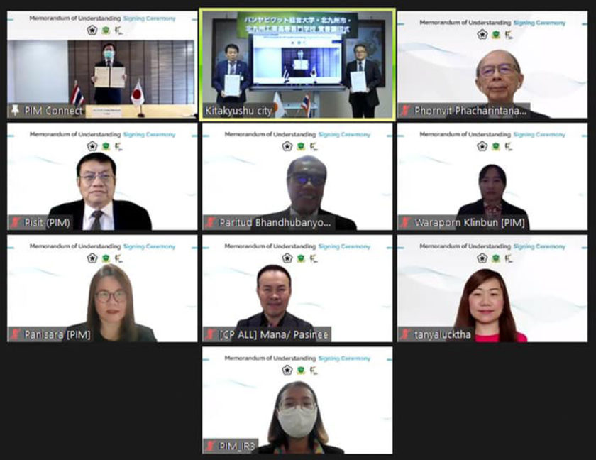 คณะวิศวกรรมศาสตร์และเทคโนโลยี สถาบันการจัดการปัญญาภิวัฒน์ (PIM) ร่วมพิธีลงนามบันทึกข้อตกลงความร่วมมือทางวิชาการ (MoU) รูปแบบออนไลน์ ระหว่าง เทศบาลเมืองคิตะคิวชู จังหวัดฟูกูโอกะ ประเทศญี่ปุ่น (Bureau City of Kitakyushu) และ National Institute of Technology, Kitakyushu College (NITKIT) ประเทศญี่ปุ่น ต่อเนื่องเป็นปีที่ 4 ภายใต้ “โครงการฝึกปฏิบัติและบรรจุงานร่วมกับเทศบาลเมืองคิตะคิวชู ประเทศญี่ปุ่น”โดยความร่วมมือดังกล่าวเพื่อสนับสนุนการศึกษา การฝึกปฎิบัติงาน การวิจัย การแลกเปลี่ยนบุคลากร การจ้างงานของนักศึกษาในอนาคต และส่งเสริมการสร้างวิศวกรรุ่นใหม่ภาคอุตสาหกรรมที่มีศักยภาพพร้อมทำงานในระดับสากล เพื่อตอบโจทย์นโยบายการพัฒนาทรัพยากรมนุษย์ของไทยและญี่ปุ่น การขยายตัวของอุตสาหกรรมในเมืองคิตะคิวชซึ่งเป็นเมืองอุตสาหกรรมขนาดใหญ่ของญี่ปุ่น จึงต้องการผู้เชี่ยวชาญเฉพาะทางเพิ่มมากขึ้น การนี้ รองศาสตราจารย์ ดร.สมภพ มานะรังสรรค์ อธิการบดี พีไอเอ็ม, อาจารย์พรวิทย์ พัชรินทร์ตนะกุล รองอธิการบดีอาวุโสฝ่ายวิชาการ พีไอเอ็ม, Mr. Shinya Ikenaga Chief Executive, Industry and Economics Bureau, City of Kitakyushu และ Mr. Tetsuyuki Hongo อธิการบดี จาก National Institute of Technology, Kitakyushu College (NITKIT) ประเทศญี่ปุ่น ให้เกียรติเป็นประธานร่วมในพิธี พร้อมด้วยผู้บริหารทั้ง 3 ฝ่ายเข้าร่วมเป็นสักขีพยานในรูปแบบการประชุมทางไกลวิดีโอคอนเฟอเรนซ์ ทั้งนี้นักศึกษาในโครงการจะได้เปิดโลกทัศน์ใหม่เพื่อค้นหาตัวเองและเป้าหมายในชีวิต เพิ่มความเป็นมืออาชีพให้กับตนเองและองค์กรในคราวเดียวกันอย่างเป็นรูปธรรม โดยความเข้มข้นของโครงการจะสั่งสมการฝึกปฏิบัติงานจริงกับบริษัทของญี่ปุ่น ศึกษานวัตกรรมและเทคโนโลยีขั้นสูง เติมประสบการณ์ด้านการทำงานเพื่อประกอบอาชีพ ด้านภาษา และความเข้าใจวัฒนธรรมญี่ปุ่นอย่างใกล้ชิดผ่านการสนับสนุนโดย Bureau City of Kitakyushu ตลอดจนการฝึกฝนเพิ่มทักษะต่างๆ ผ่านการรับผิดชอบภารกิจ ได้ร่วมทำโปรเจกต์ที่ NITKIT หนึ่งในสถาบันเทคโนโลยีแห่งชาติญี่ปุ่น นับเป็นสถาบัน KOSEN ที่มีระบบการศึกษาด้านเทคโนโลยีที่มีความเชี่ยวชาญ เฉพาะในญี่ปุ่น เน้นการสร้างบุคลากรเพื่อรองรับการปฎิบัติงานจริง เป็นที่ยอมรับทั้งในภาคอุตสาหกรรมและในภาควิชาการ