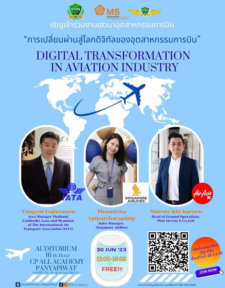 สาขาการจัดการธุรกิจการบิน คณะวิทยาการจัดการ สถาบันการจัดการปัญญาภิวัฒน์ (พีไอเอ็ม) ขอเชิญร่วมงานเสวนาวิชาการ อุตสาหกรรมการบิน ในหัวข้อ “การเปลี่ยนผ่านสู่โลกดิจิทัลของอุตสาหกรรมการบิน (Digital Transformation in Aviation Industry)” โดยได้รับเกียรติจาก คุณยงยุทธ ลุจินตานนท์ Area Manager Thailand Laos Cambodia and Myanmar, The International Air Transport Association (IATA), คุณนิติโรจน์ กิจเจริญ Head of Ground Operation, Thai Airasia X Co.,Ltd. และ คุณธันย์นิชา อภิพัชรพิมพ์ Sales Manager, Singapore Airlines มาร่วมแชร์องค์ความรู้และประสบการณ์ด้านการบินและการท่องเที่ยว เพื่อเปิดโอกาสให้อาจารย์ นักศึกษา และบุคคลทั่วไป ได้รับความรู้ที่เกี่ยวข้องกับสถานการณ์ทิศทางด้านการบินและการท่องเที่ยวในปัจจุบัน สอดรับกับนโยบายของรัฐบาล อีกทั้งยังเป็นเวทีแลกเปลี่ยนองค์ความรู้เฉพาะทางที่เกี่ยวข้องทางด้านการบินเพื่อก้าวสู่การพัฒนาบุคลากรเข้าสู่ตลาดอุตสาหกรรมการบินของประเทศไทยในอนาคต ณ ห้อง Auditorium ชั้น 16 อาคาร CP All Academy สถาบันการจัดการปัญญาภิวัฒน์ ถนนแจ้งวัฒนะ ฟรี! ไม่มีค่าใช้จ่าย