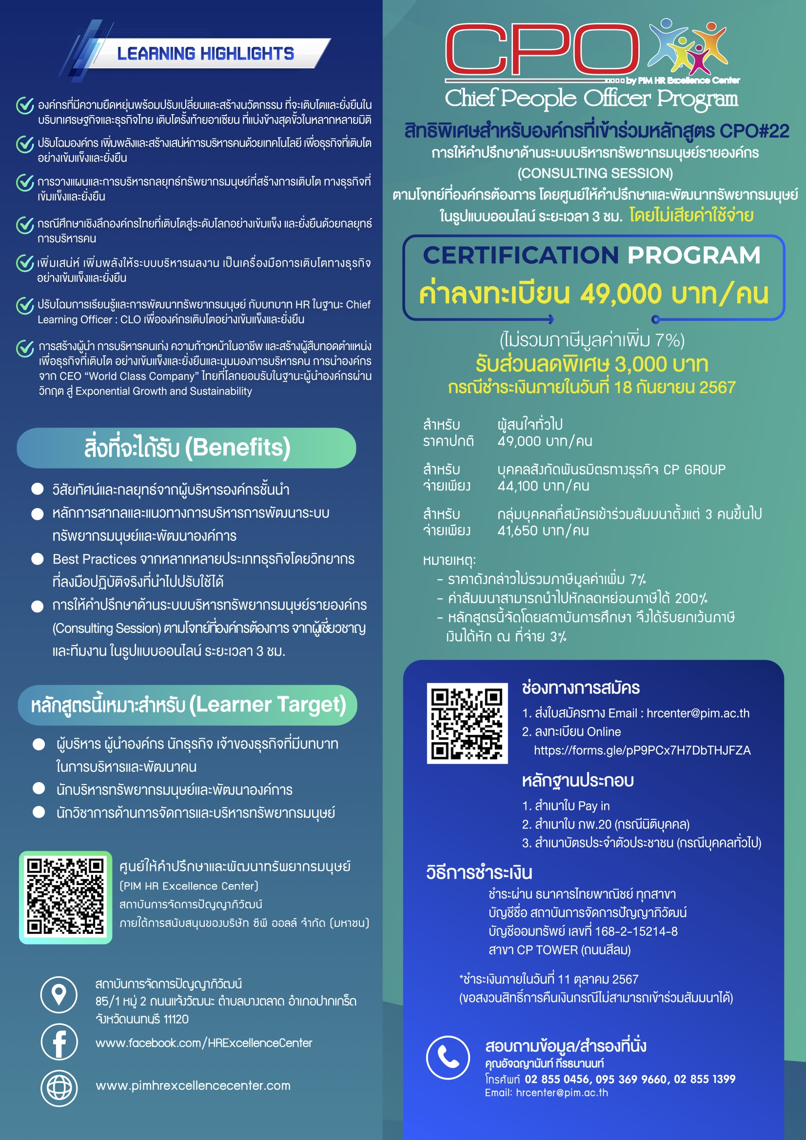 ศูนย์ให้คำปรึกษาและพัฒนาทรัพยากรมนุษย์ (PIM HR Excellence Center) สถาบันการจัดการปัญญาภิวัฒน์ จัดสัมมนาเชิงปฏิบัติการ Chief People Officer Program (CPO#22) : กลยุทธ์การสร้างและพัฒนาทรัพยากรมนุษย์ รุ่นที่ 22 “Charming and Powerful People System for Exponential Growth and Sustainability”