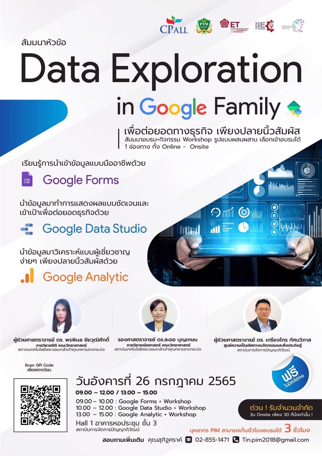 ศูนย์เครือข่ายเทคโนโลยีและนวัตกรรม สำนักบริการวิชาการ ร่วมกับ ศูนย์ความเป็นเลิศทางนวัตกรรมและสิ่งประดิษฐ์ คณะวิศวกรรมศาสตร์และเทคโนโลยี สถาบันการจัดการปัญญาภิวัฒน์ ขอเรียนเชิญเข้าร่วมงานสัมมนาเชิงปฏิบัติการและบรรยายพิเศษสุดเข้มข้นในรูปแบบผสมผสาน Online-Onsite หัวข้อเรื่อง “Data exploration in google family” เพื่อต่อยอดทางธุรกิจ เพียงปลายนิ้วสัมผัส