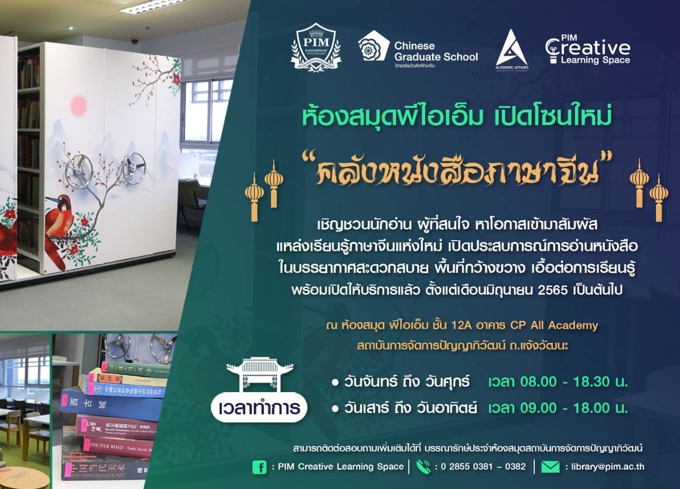 ห้องสมุด พีไอเอ็ม (PIM Creative Learning Space) เชิญชวนนักอ่าน ผู้ที่สนใจ หาโอกาสเข้ามาสัมผัสแหล่งเรียนรู้ภาษาจีนแห่งใหม่นี้ เปิดประสบการณ์การอ่านหนังสือในบรรยากาศสะดวกสบาย พื้นที่กว้างขวาง เอื้อต่อการเรียนรู้ “คลังหนังสือภาษาจีน” พร้อมเปิดให้บริการแล้ว ตั้งแต่เดือนมิถุนายน 2565 เป็นต้นไป ณ ห้องสมุด พีไอเอ็ม ชั้น 12A อาคาร CP All Academy สถาบันการจัดการปัญญาภิวัฒน์ ถ.แจ้งวัฒนะ เวลาทำการ วันจันทร์ ถึง วันศุกร์ เวลา 8.00 – 18.30 น. และ วันเสาร์ ถึง วันอาทิตย์ เวลา 9.00 – 18.00 น.
