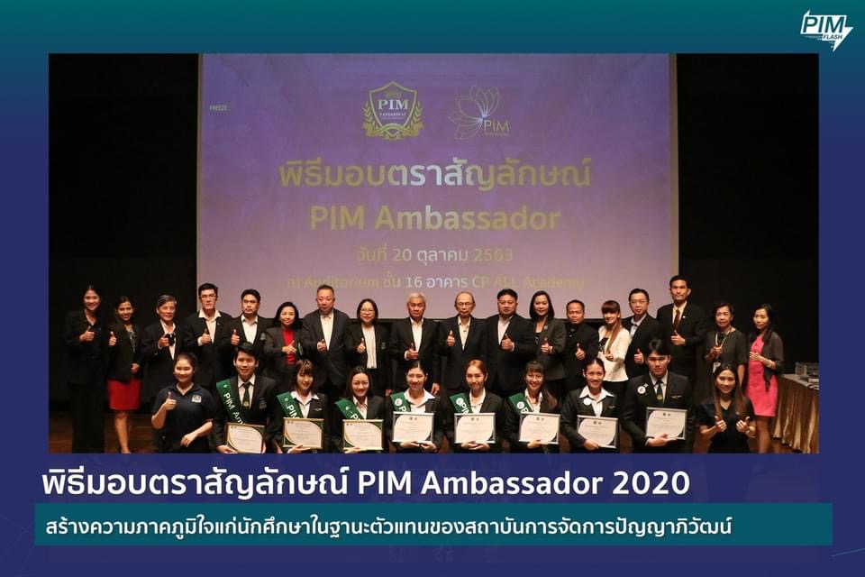 เมื่อวันที่ 20 ตุลาคม 2563 ที่ผ่านมา สถาบันการจัดการปัญญาภิวัฒน์จัดพิธีมอบตราสัญลักษณ์ PIM Ambassador 2020 นักศึกษาที่ผ่านการคัดเลือก ประจำปีการศึกษา 2563 รวม 145 คน จากทุกคณะวิชา และ 1 วิทยาลัยนานาชาติ