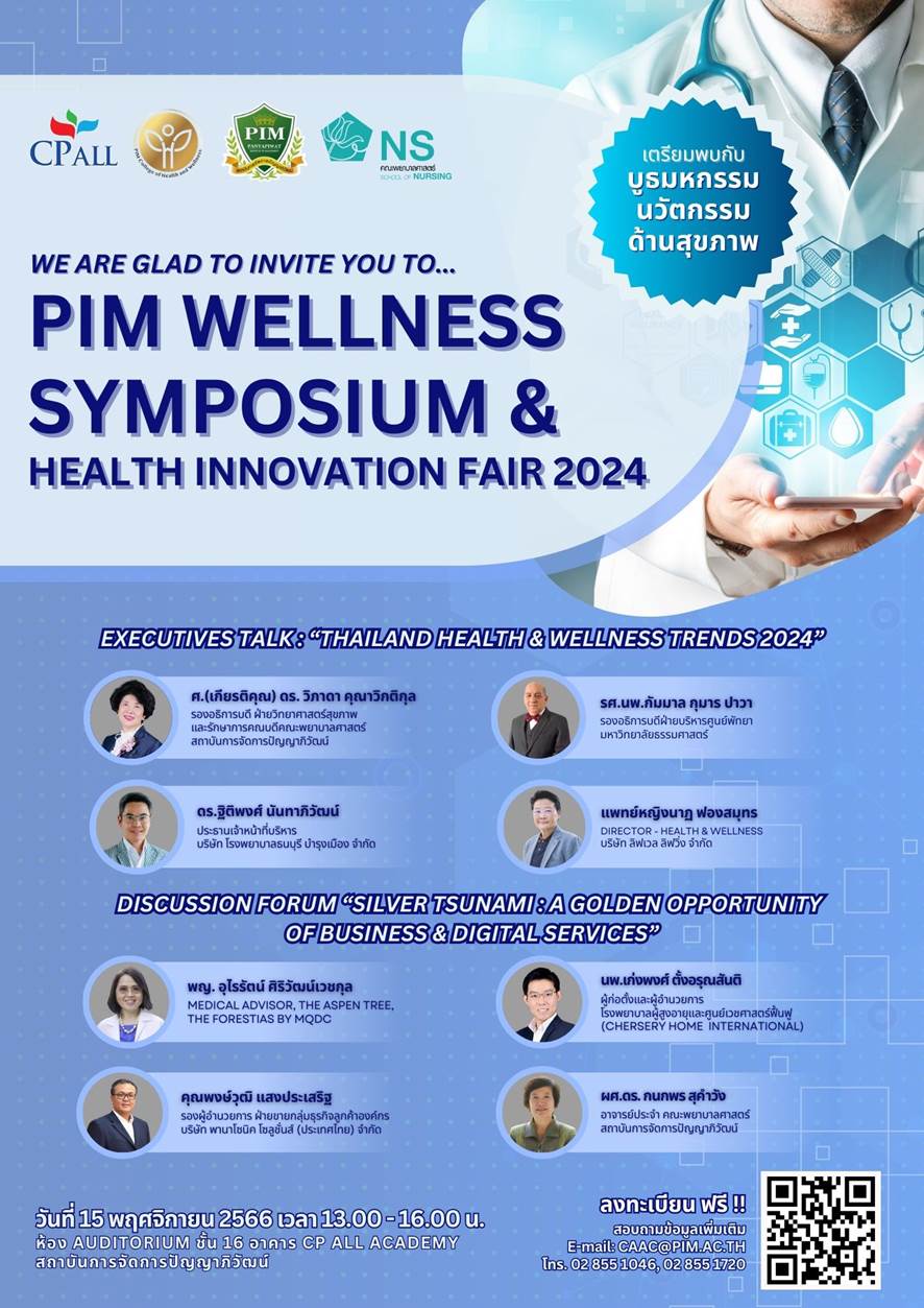 ชีวาสุขวิทยาลัย (College of Health & Wellness) สถาบันการจัดการปัญญาภิวัฒน์ (พีไอเอ็ม) ขอเชิญร่วมงาน PIM WELLNESS SYMPOSIUM & HEALTH INNOVATION FAIR เพื่อตอกย้ำวิสัยทัศน์และความมุ่งมั่นในการเป็นองค์กรด้านวิทยาศาสตร์สุขภาพระดับชั้นนำ ขยายองค์ความรู้ในสาขาวิทยาศาสตร์สุขภาพของพีไอเอ็มแก่ ผู้บริหารองค์กรด้านการบริการสุขภาพ นักวิชาการ นักศึกษา ได้รับทราบเทรนด์ของธุรกิจสุขภาพ โอกาสทางธุรกิจและการให้บริการสุขภาพที่เปลี่ยนแปลงไป ตลอดจนการปรับองค์กร การปรับตัวผู้ปฏิบัติงานในการให้บริการสุขภาพในยุค Aging Society ภายในงานจะได้พบกับ Executive Talk หัวข้อ “Thailand Health & Wellness Trends 2024” โดย 4 วิทยากร ได้แก่ ศ.(เกียรติคุณ) ดร.วิภาดา คุณาวิกติกุล รองอธิการบดี ฝ่ายวิทยาศาสตร์สุขภาพและรักษาการคณบดีคณะพยาบาลศาสตร์ สถาบันการจัดการปัญญาภิวัฒน์ ดร.ฐิติพงศ์ นันทาภิวัฒน์ ประธานเจ้าหน้าที่บริหาร บริษัท โรงพยาบาลธนบุรี บำรุงเมือง จำกัด รศ.นพ.กัมมาล กุมาร ปาวา รองอธิการบดีฝ่ายบริหารศูนย์พัทยา มหาวิทยาลัยธรรมศาสตร์ และ พญ.นาฏ ฟองสมุทร DIRECTOR – HEALTH & WELLNESS บริษัท ลิฟเวล ลิฟวิ่ง จำกัด