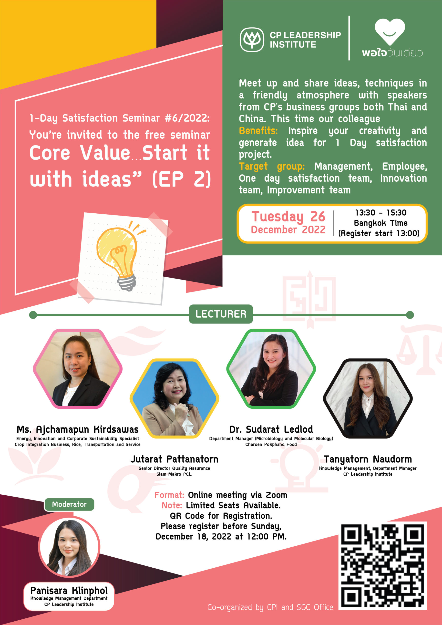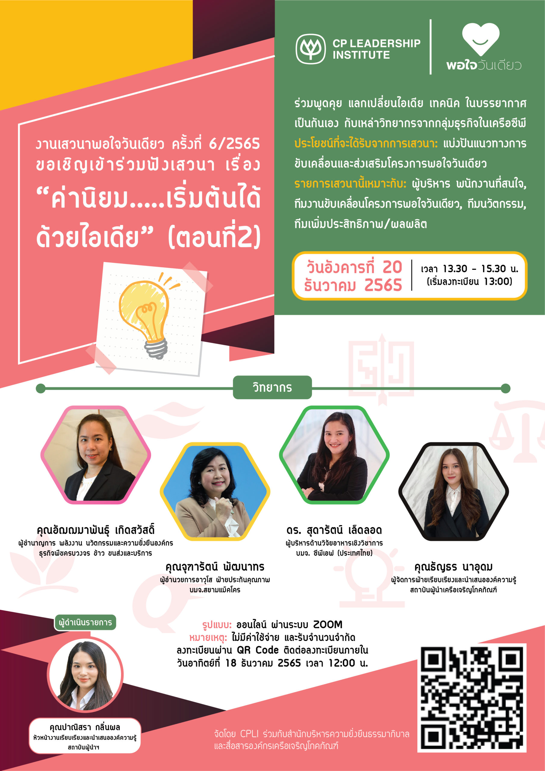 ชวนชาวซีพีงานเสวนาพอใจวันเดียวครั้งที่ 6/2022 ในหัวข้อ ค่านิยม…เริ่มต้นได้ด้วยไอเดีย (ตอนที่2) ในวันที่ 20 ธันวาคม 2565 เวลา 13:30-15:30 น. ผ่านระบบออนไลน์ เริ่มเปิดห้อง Zoom เวลา 13:00 น.
