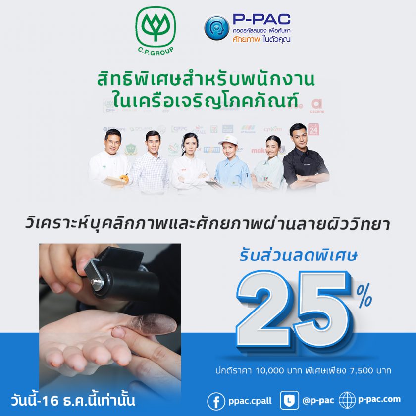 ข่าวดี!!!  สำหรับพนักงานเครือเจริญโภคภัณฑ์  เข้ารับบริการวิเคราะห์บุคลิกภาพและศักยภาพบุคคลผ่านลายผิววิทยา รับส่วนลดพิเศษ 25% ราคาพิเศษเพียง 7,500 บาท (จากราคาปกติ 10,000 บาท)