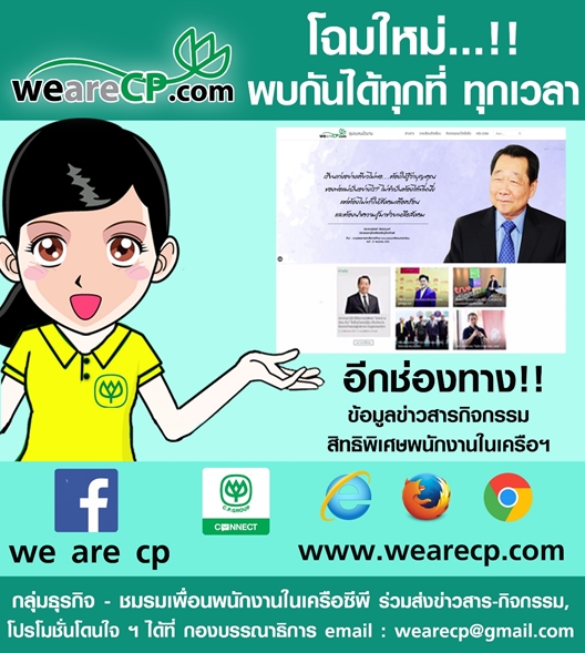 จึงอยากจะชวนชาวซีพีช่วยกันบอกต่อเพื่อนๆแต่ละกลุ่มธุรกิจสามารถติดตามข่าวสารทาง wearecp.com หากเพื่อนๆชาวซีพีไม่ว่าจะเป็นหน่วยงาน ชมรมพนักงานหรือเพื่อนพนักงานมีข่าวสาร กิจกรรมอะไรดีๆที่ต้องการเผยแพร่ให้ชาวซีพีรับรู้สามารถส่งข่าวสารให้กับกองบรรณาธิการ wearecp.com ได้ตลอดเวลา