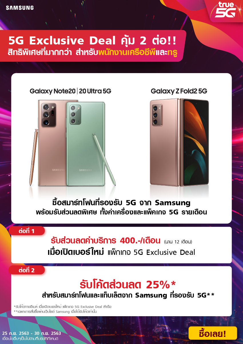 – เมื่อสมัครแพ็กเกจ 5G Exclusive Deal ที่เว็บไซต์ทรูสโตร์ สำเร็จ จะได้รับโค้ดส่วนลดทางอีเมล์ เพื่อซื้อสมาร์ทโฟนและแท็บเล็ต Samsung รุ่นรองรับ 5G ที่ร่วมรายการ