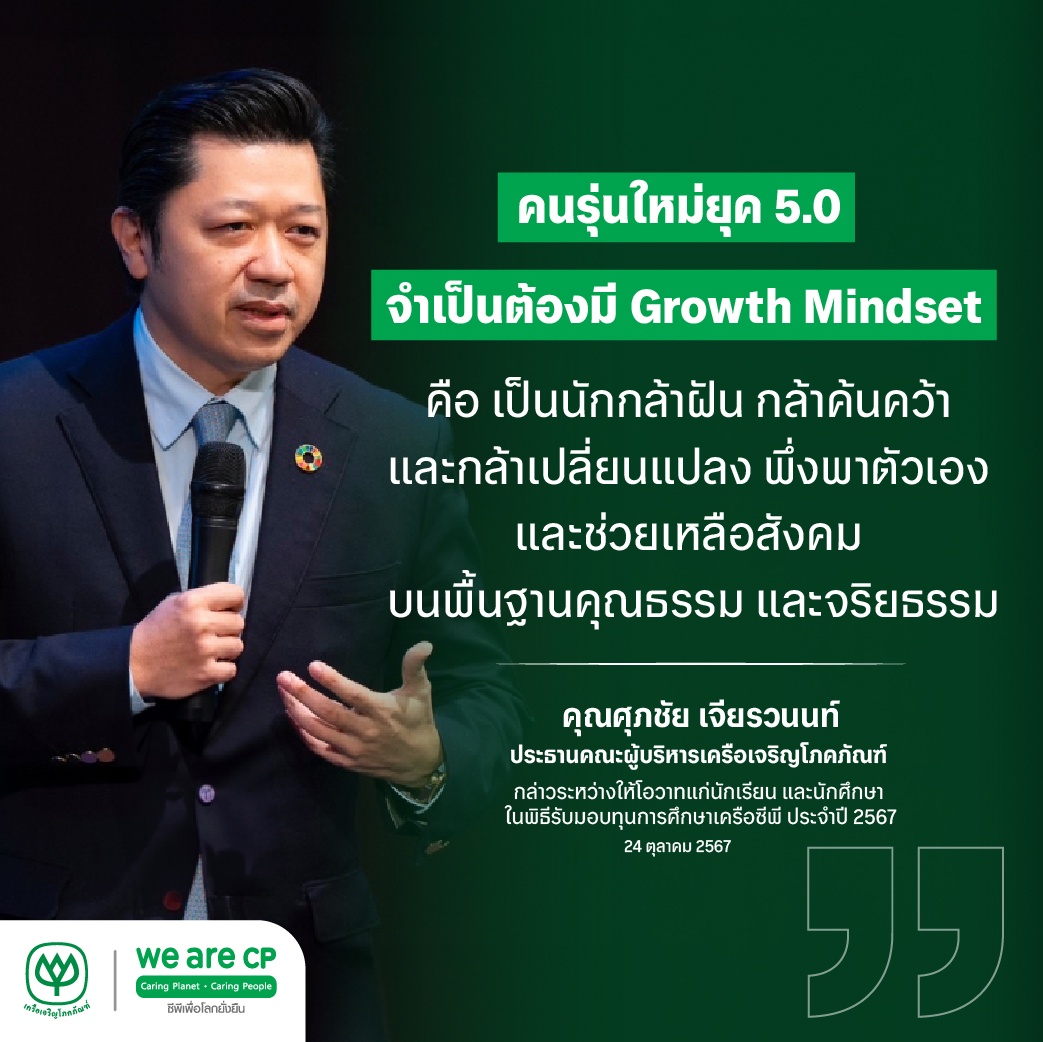 “คนรุ่นใหม่ยุค 5.0 จำเป็นต้องมี Growth Mindset คือ เป็นนักกล้าฝัน กล้าค้นคว้า และกล้าเปลี่ยนแปลง พึ่งพาตัวเอง และช่วยเหลือสังคม บนพื้นฐานคุณธรรม และจริยธรรม”
