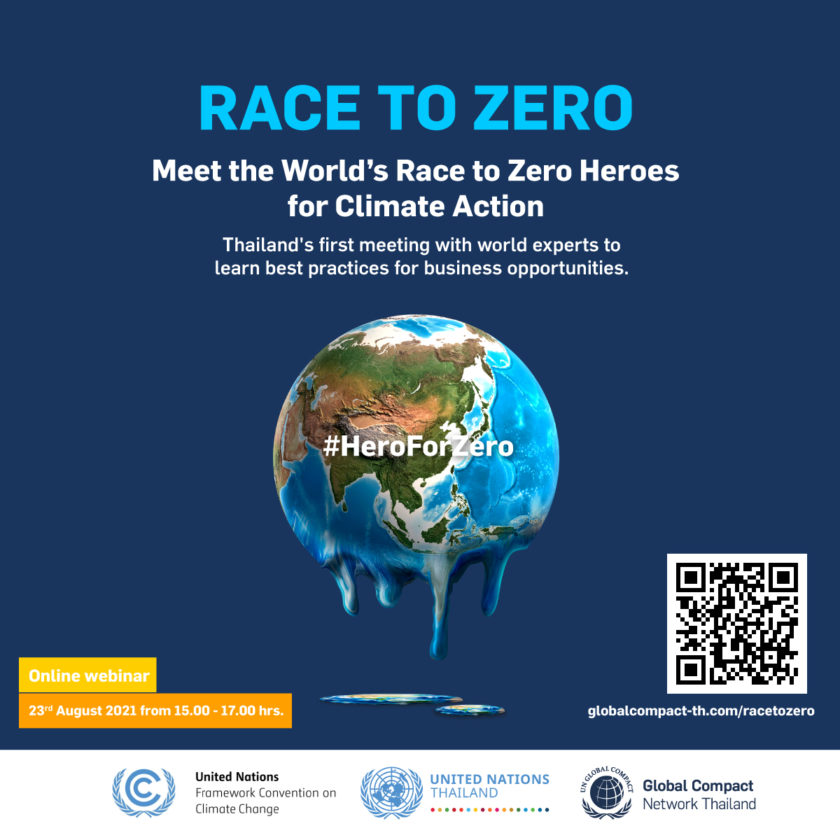 Global Compact Network Thailand ร่วมกับ United Nations และ United Nations Thailand ขอเชิญพนักงานของสมาชิก Global Compact Network Thailand และผู้สนใจเข้าร่วมงานสัมมนาออนไลน์ Race to Zero: Meet the World’s Race to Zero Heroes for Climate Action ในวันจันทร์ที่ 23 ส.ค. 64 เวลา 15:00 – 17:00 น. โดยไม่มีค่าใช้จ่าย ดูรายละเอียดและลงทะเบียนได้แล้ววันนี้ ทาง https://globalcompact-th.com/racetozero