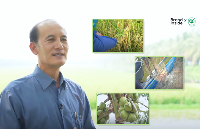 คุณขุนศรีเล่าว่า ฐานคิดของ CP ประกอบด้วย 3 ประกอบกัน คือ ประเทศชาติ-ประชาชน-บริษัท เกษตรกรต้องได้รับผลประโยชน์จากแนวคิดนี้ ต้องใช้พื้นที่ทำ 3 อย่างผสมกันไปคือ ปลูกข้าว เลี้ยงปลา ปลูกมะพร้าว ถือว่าเป็นการใช้พื้นที่ทำให้เกิดประโยชน์สูงสุด สาเหตุที่ต้องปลูกมะพร้าว เพราะสร้างรายได้สูง ใช้สารเคมีน้อย ร่มเงาจากกิ่งก้านมะพร้าวช่วยบังแดดให้ปลาได้