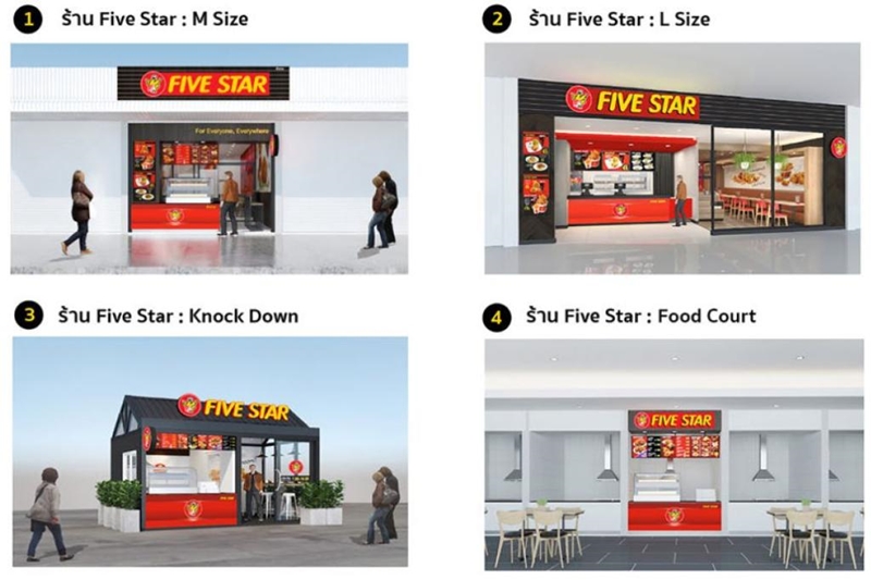 โดยธุรกิจห้าดาวรูปแบบร้านอาหารนั้นกำลังเป็นที่สนใจเพราะสามารถคืนทุนได้ไวที่สุดด้วยความหลากหลายของขนาดร้านที่แบ่งมาให้ตามความเหมาะสมของทำเลที่ตั้งดังนี้