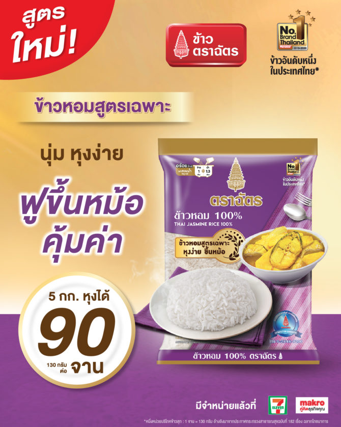 ถ้าใครกำลังมองหาข้าวตราฉัตรถุงสีม่วงใน 7-11 และ Makro ข้าวที่ร้านอาหารไว้วางใจ ตอนนี้ “ฉัตรม่วง” ปรับสูตรและโฉมใหม่เป็น “ข้าวหอมสูตรเฉพาะ” อร่อยขึ้นกว่าเดิม นุ่ม หุงง่าย ฟูขึ้นหม้อ คุ่มค่า เพราะขนาด 5 กก. สามารถหุงข้าวได้ถึง 90 จาน (130 กรัมต่อจาน) มาพร้อมกับแพคเกจจิ้ง (Packaging) ถุงข้าวสารที่สวยงาม บนหน้าถุงโชว์ภาพจานข้าว และเมนูอาหารน่ารับประทาน