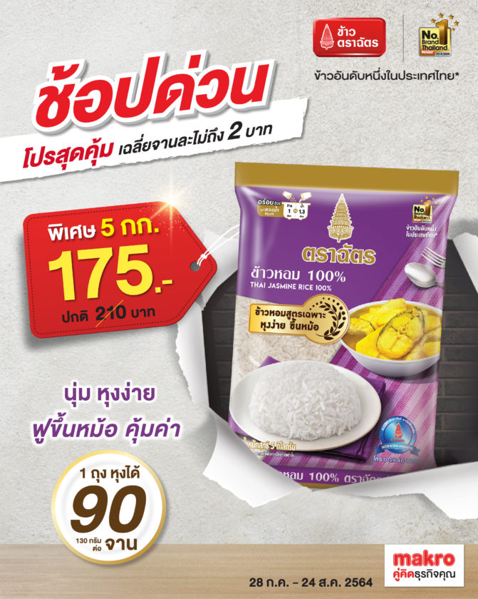 ตอนนี้มีจัดโปรโมชั่นช่วยเหลือผู้ประกอบการ ร้านอาหาร และร้านโชห่วย เพื่อสู้สถานการณ์โควิดนี้ไปด้วยกัน ข้าวหอม 100% ตราฉัตร ขนาด 5 กก. ราคาพิเศษ 175 บาท ที่ห้าง Makro ทุกสาขาทั่วประเทศ เริ่มตั้งแต่วันนี้-24 ส.ค.64