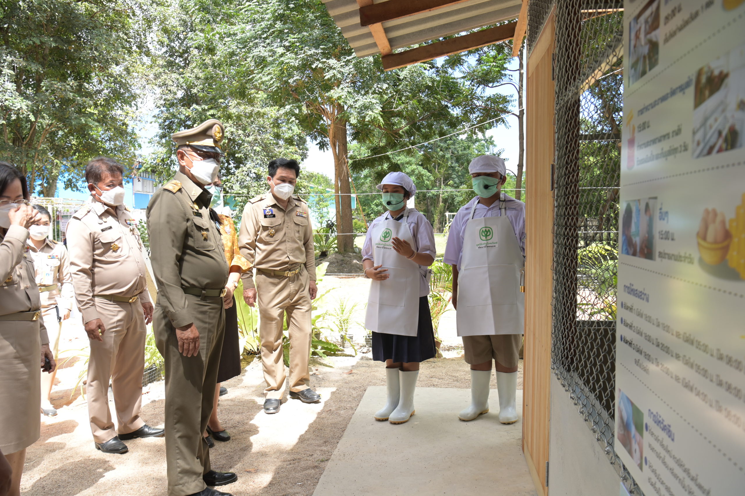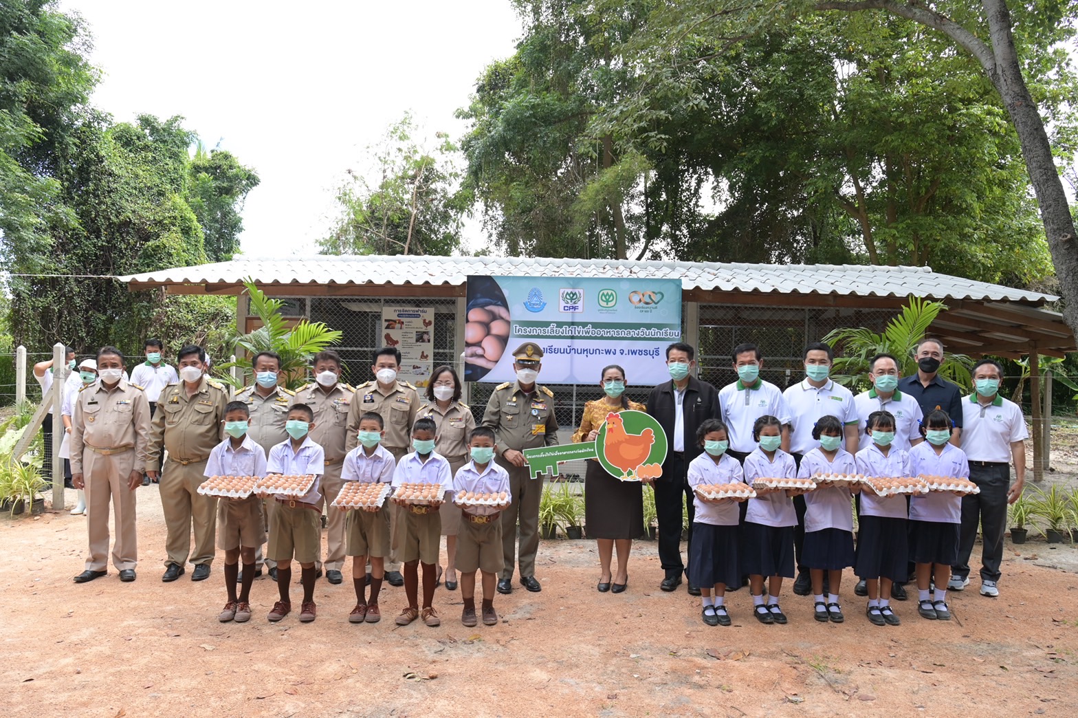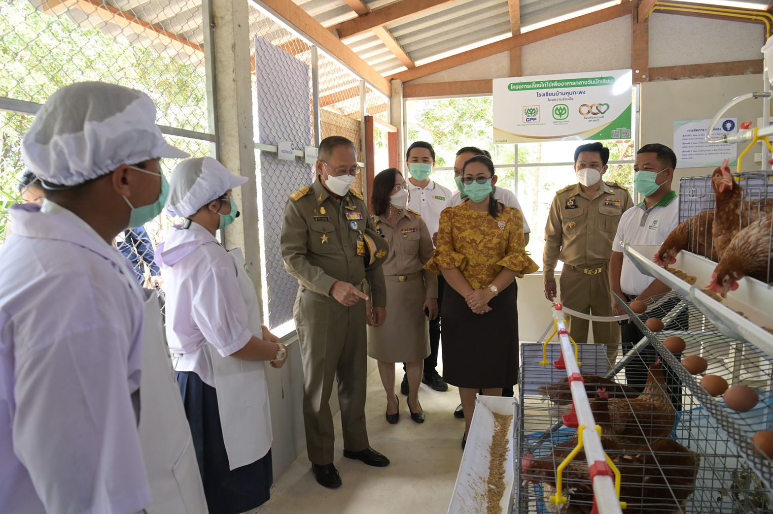 จากนั้น ท่านองคมนตรีฯ ได้เป็นประธานการส่งมอบโรงเรือนเลี้ยงไก่ไข่ ในโครงการเลี้ยงไก่ไข่เพื่ออาหารกลางวันนักเรียน โรงเรียนบ้านหุบกะพง พร้อมทั้งรับฟังการบรรยายการบริหารจัดการและการดูแลโครงการฯ โดยครูและนักเรียน เข้าเยี่ยมชมกระบวนการผลิตป่านศรนารายณ์ ตั้งเเต่ต้นน้ำ กลางน้ำ เเละปลายน้ำ ของกลุ่มสหกรณ์การเกษตรหุบกะพง จำกัด (ในพระบรมราชูปถัมภ์) อีกทั้งยังร่วมกับมูลนิธิฯ กลุ่มธุรกิจเครือซีพี หน่วยงานภาครัฐ ชุมชน และซีพีอาสา ปลูกต้นป่านศรนารายณ์ ในพื้นที่ 5 ไร่ จำนวน 20,000 ต้น