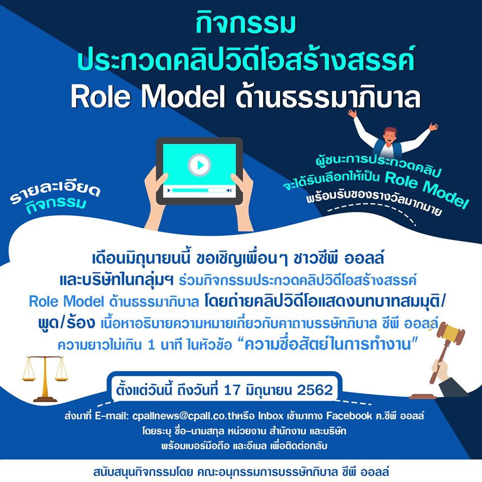 ซีพีออลล์ไอเดียดีชวนเพื่อนๆ พนักงาน ซีพี ออลล์ และบริษัทในกลุ่มฯ ร่วมกิจกรรม ประกวดคลิปวีดีโอสร้างสรรค์ Role Model เนื้อหาอธิบายความหมาย ของคาถาบรรษัทภิบาล ซีพี ออลล์ “ซื่อสัตย์ โปร่งใส ยุติธรรม คำนึงถึงชุมชนสังคม สิ่งแวดล้อม” ในหัวข้อ “ความซื่อสัตย์ในการทำงาน”
